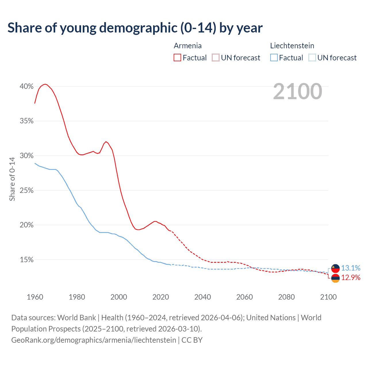 - The share of young demographic (0-15 years old) in Armenia is 19.2% vs 14.3% in Liechtenstein.