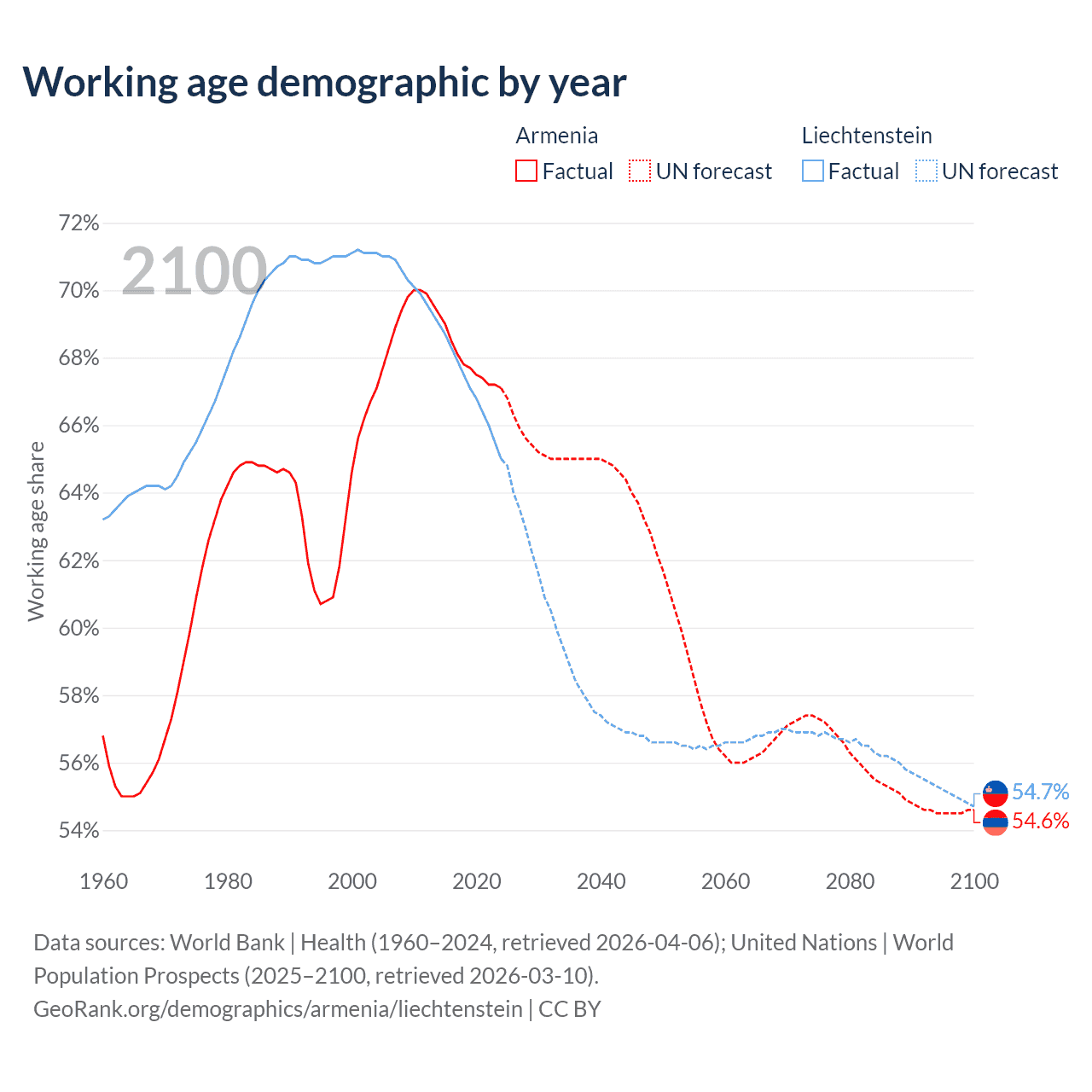 Median age Armenia vs Liechtenstein, 1960-2100
