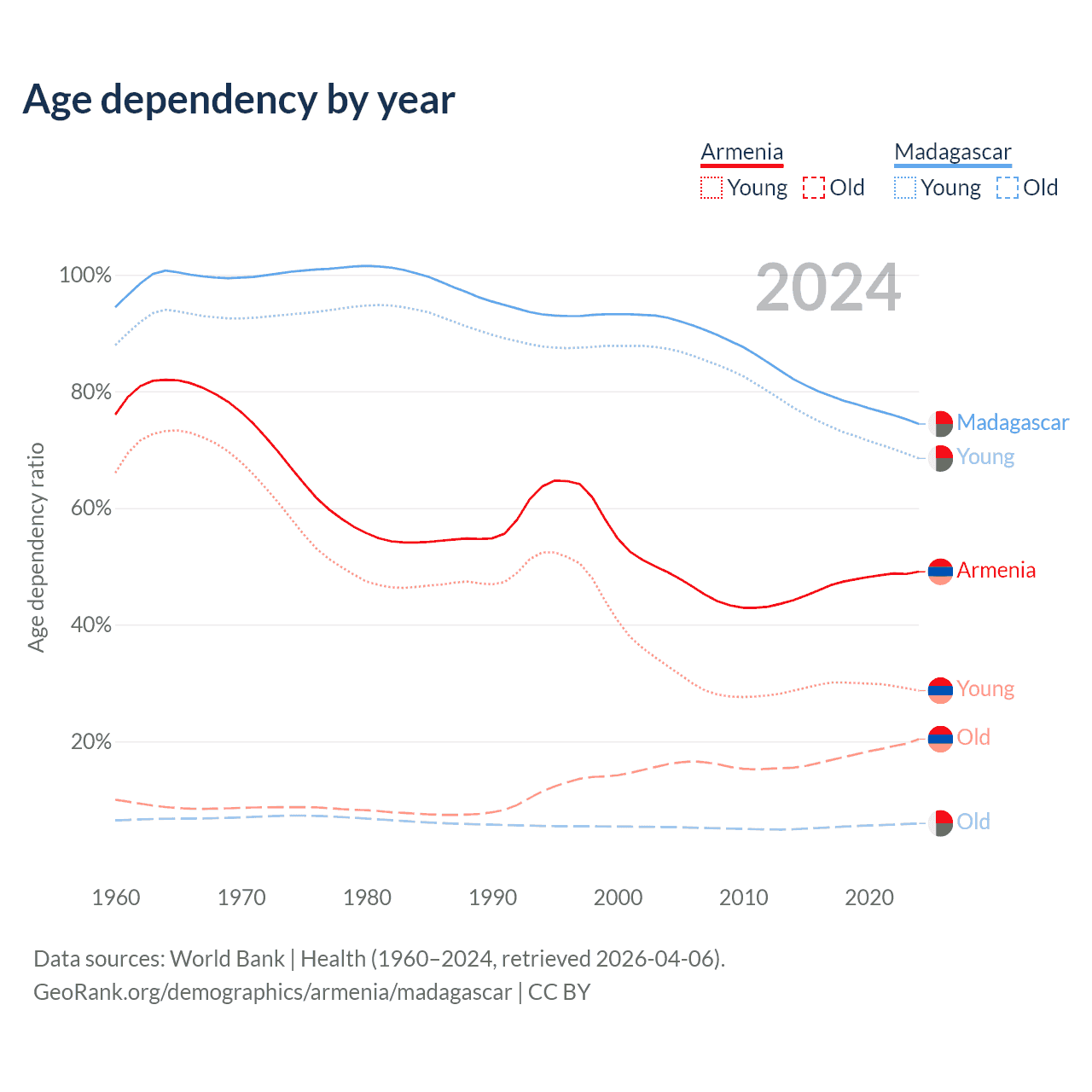 Data sources: World Bank | Health (1960–2024, retrieved 2026-04-06); U.S. Census Bureau (1960–2024, retrieved 2026-02-08).