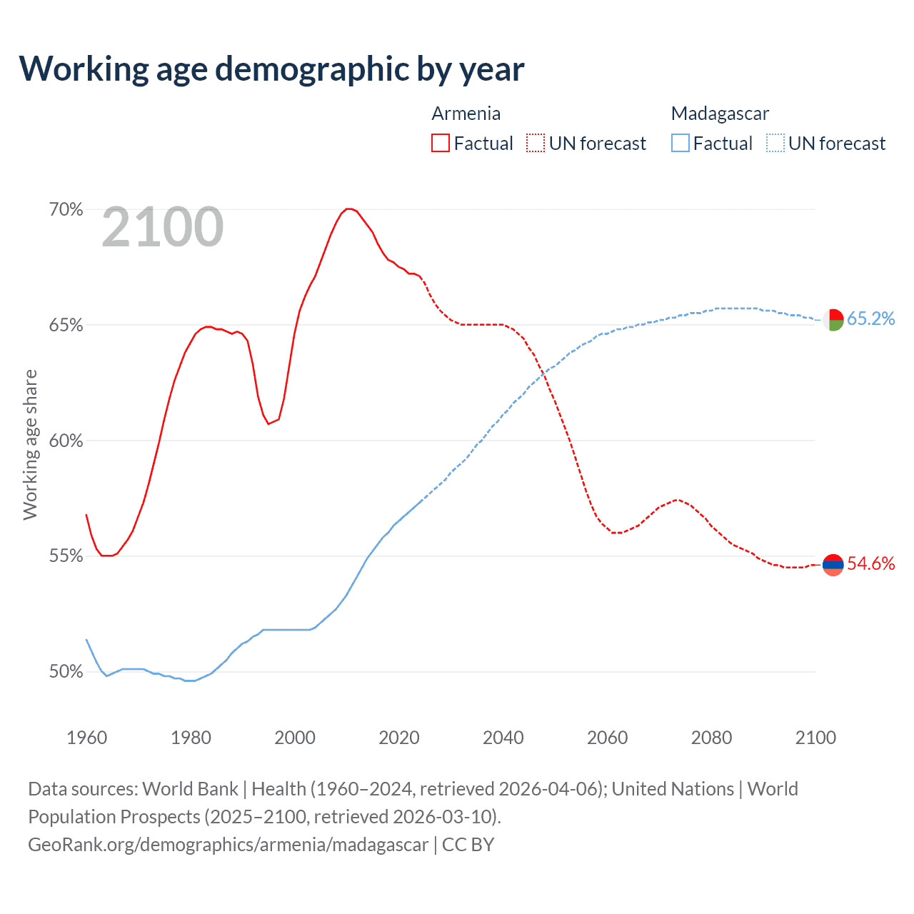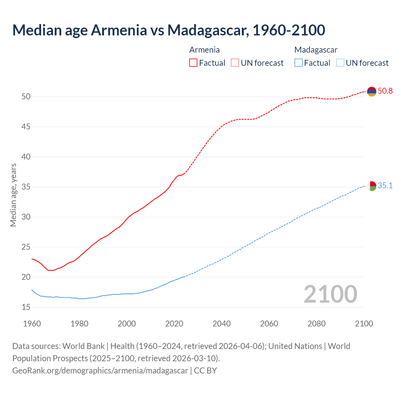 Median age Armenia vs Madagascar, 1960-2100