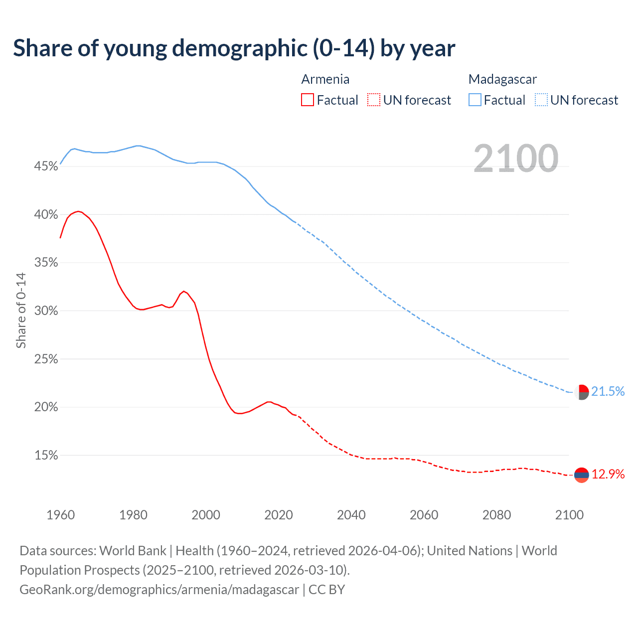 - The share of young demographic (0-15 years old) in Armenia is 19.2% vs 39.3% in Madagascar.