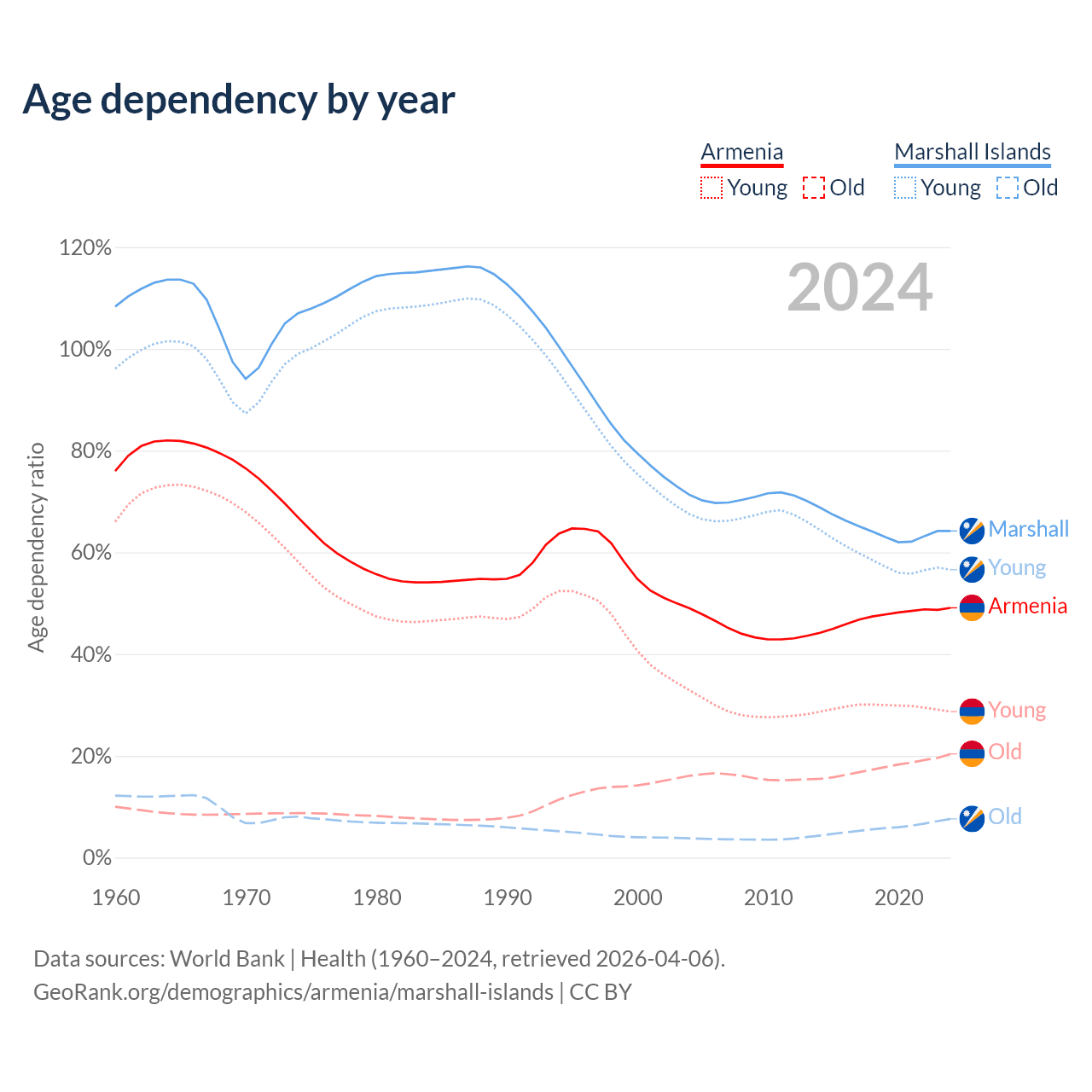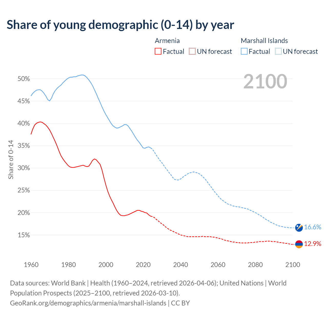 - The share of young demographic (0-15 years old) in Armenia is 19.2% vs 34.5% in the Marshall Islands.