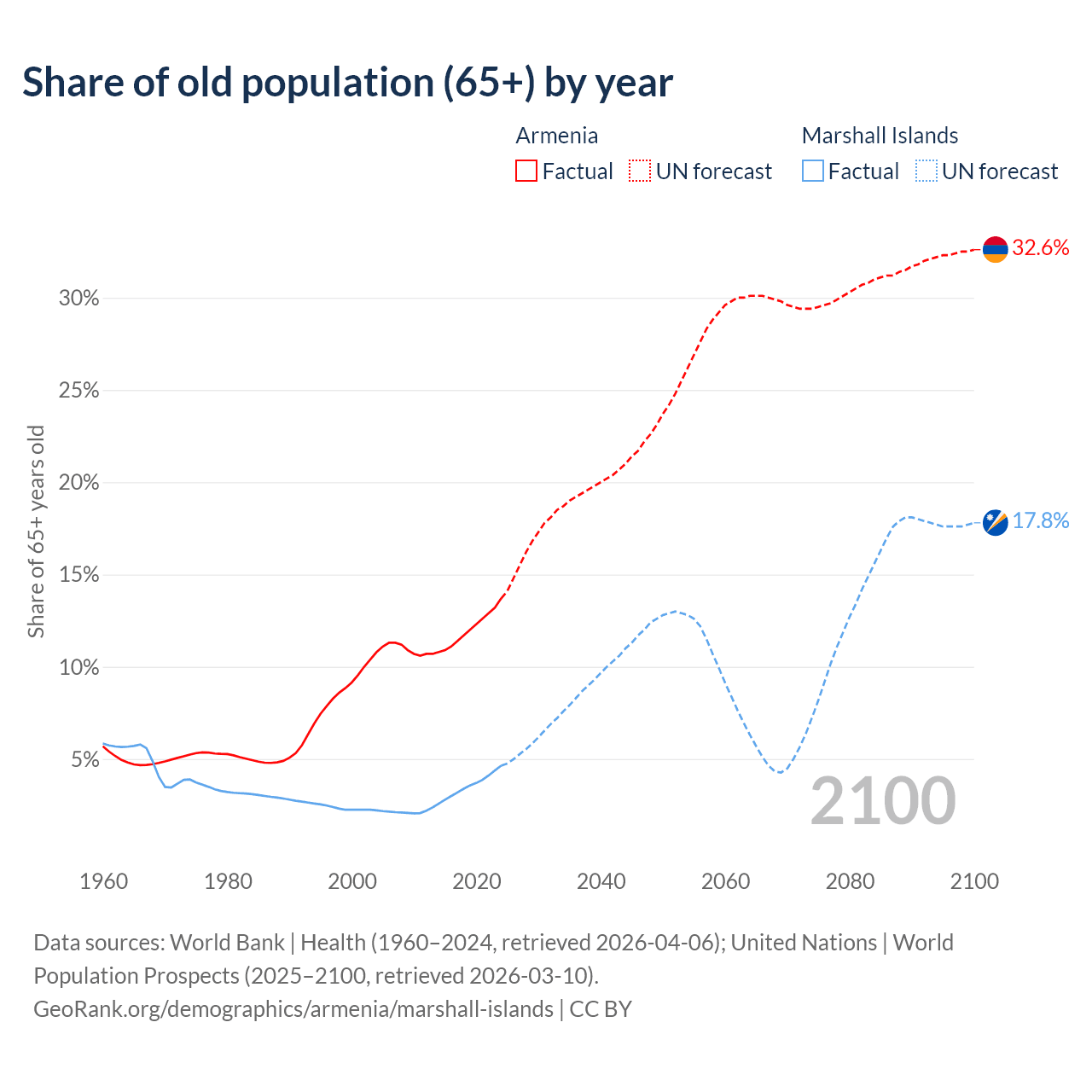 The share of older people aged 65 and over is 13.7% in Armenia and 4.64% in the Marshall Islands. Life expectancy in Armenia compared to the Marshall Islands .