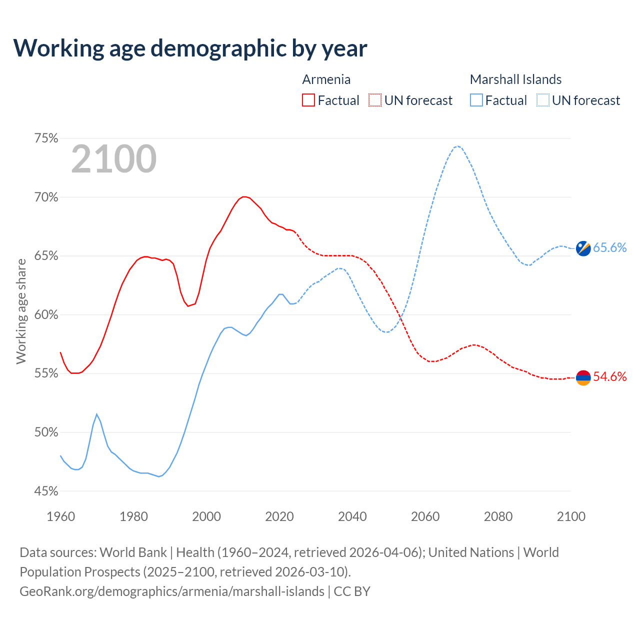 - Armenia has 2M working age adults (aged 15-64) vs 21.3K in the Marshall Islands.