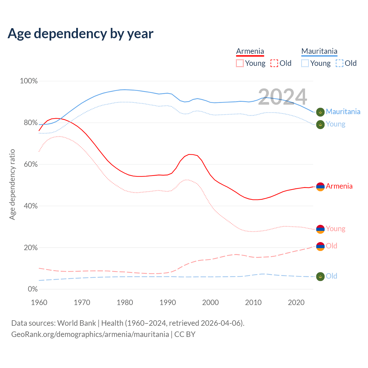 - The share of old-age demographic (65+) in Armenia is 13.7% vs 3.23% in Mauritania.