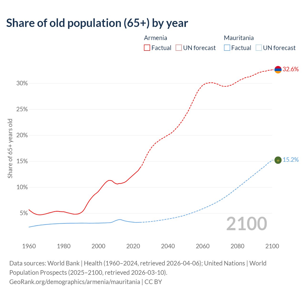 The share of older people aged 65 and over is 13.7% in Armenia and 3.23% in Mauritania. Life expectancy in Armenia compared to Mauritania .