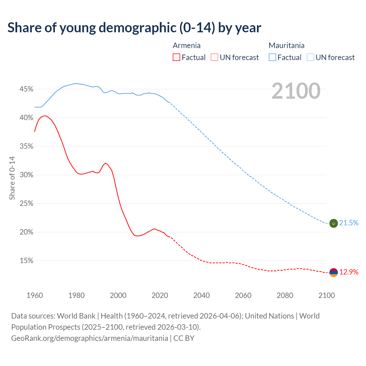 - The share of young demographic (0-15 years old) in Armenia is 19.2% vs 42.7% in Mauritania.