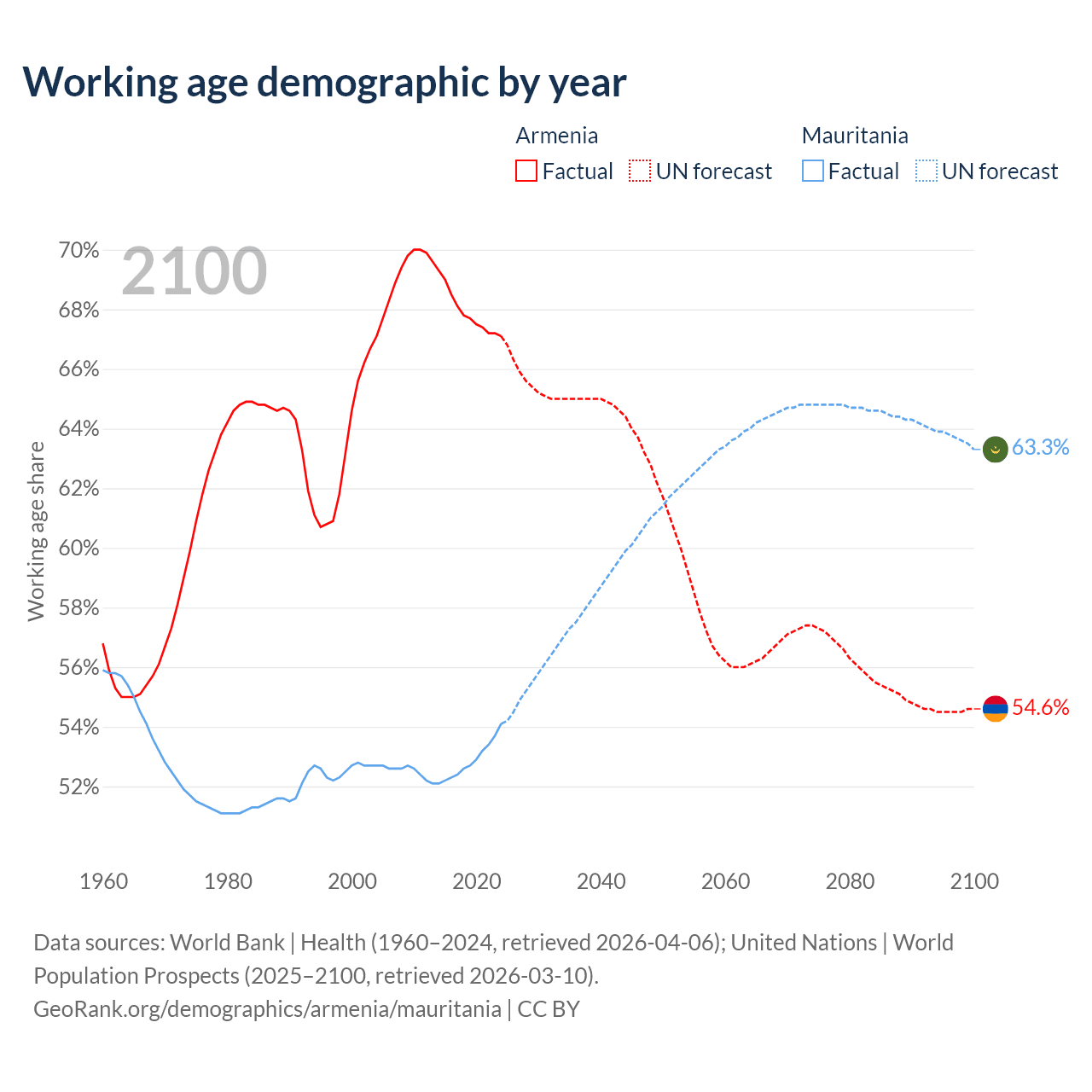 - Armenia has 2M working age adults (aged 15-64) vs 2.98M in Mauritania.
