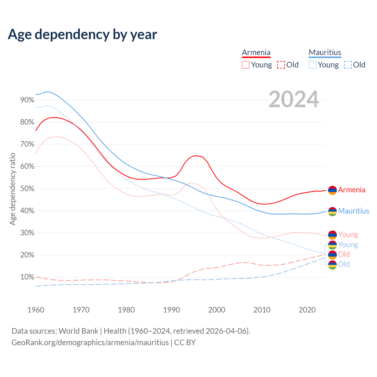 The share of older people aged 65 and over is 13.7% in Armenia and 13.5% in Mauritius. Life expectancy in Armenia compared to Mauritius .