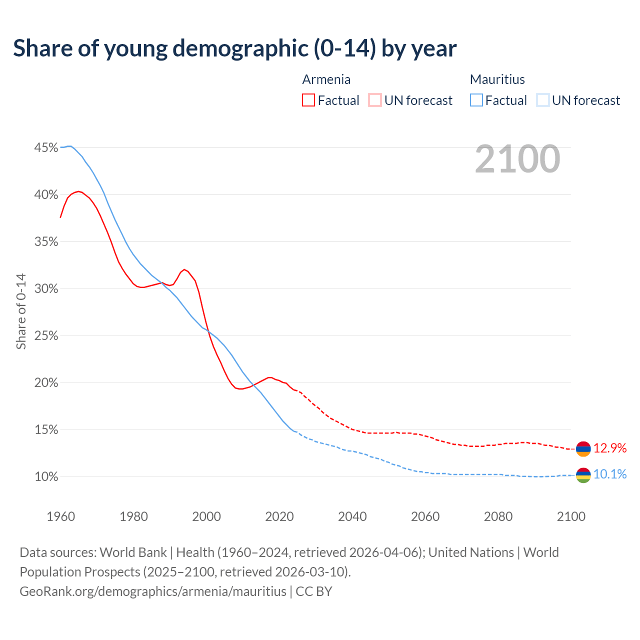 - The share of young demographic (0-15 years old) in Armenia is 19.2% vs 14.8% in Mauritius.