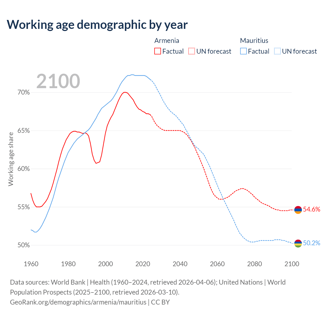 Median age Armenia vs Mauritius, 1960-2100