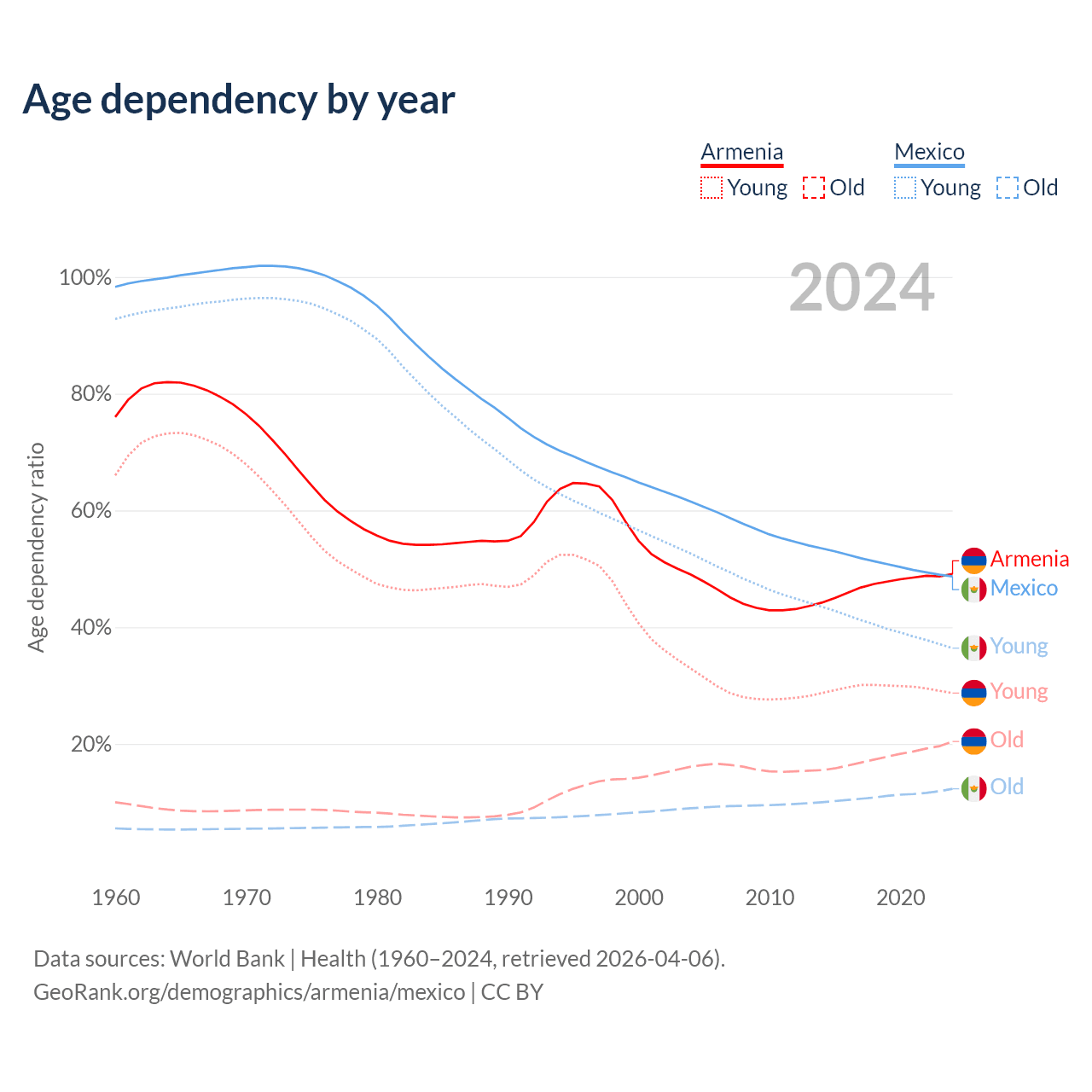 - Armenia is ranked 64/196 by median age (oldest to youngest) vs 102/196 for Mexico.