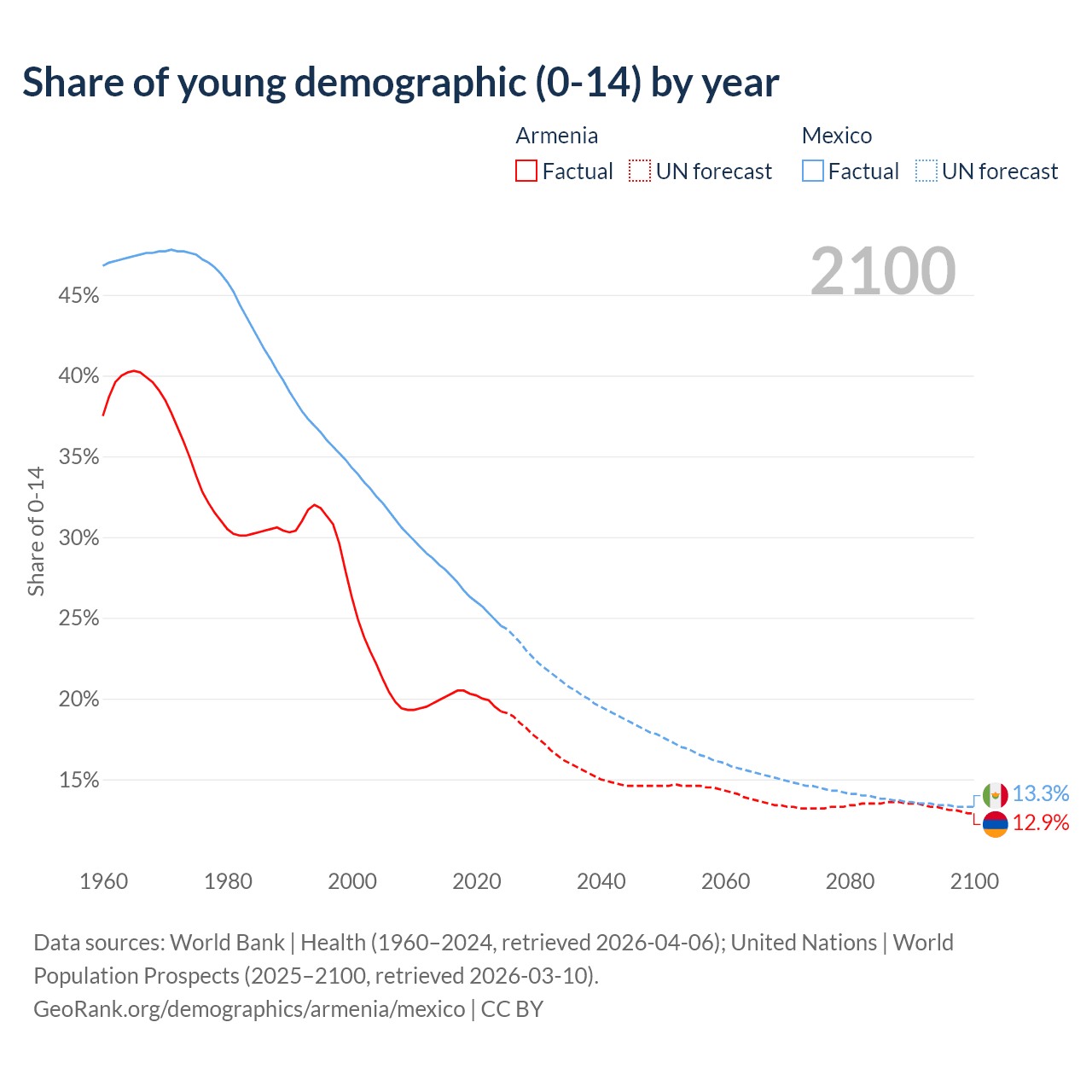 - The share of young demographic (0-15 years old) in Armenia is 19.2% vs 24.5% in Mexico.