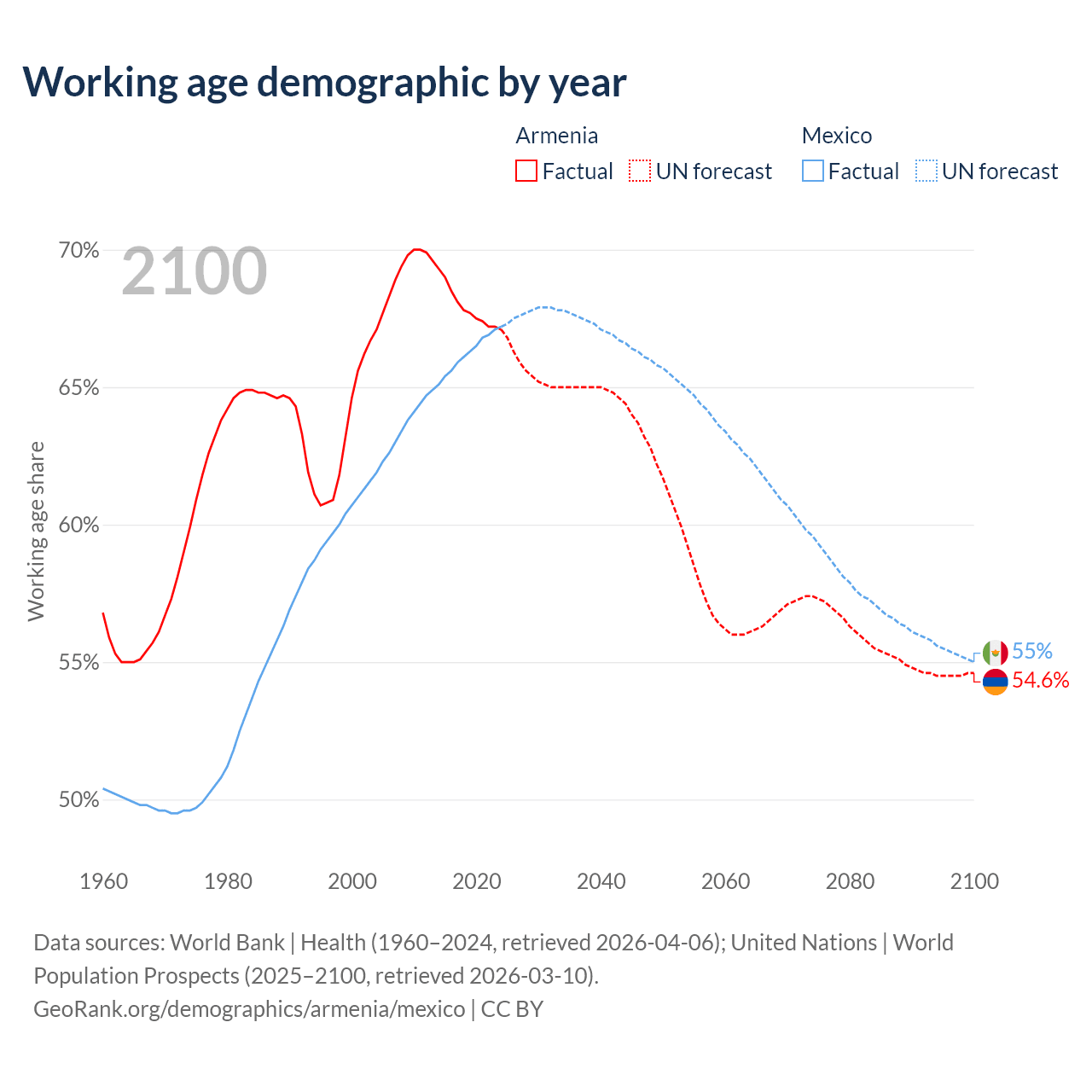 - Armenia has 2M working age adults (aged 15-64) vs 89.6M in Mexico.