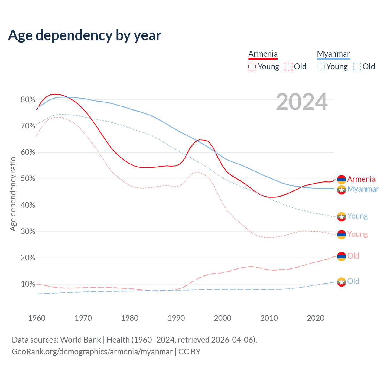 Data sources: World Bank | Health (1960–2024, retrieved 2026-04-06); U.S. Census Bureau (1960–2024, retrieved 2026-02-08).