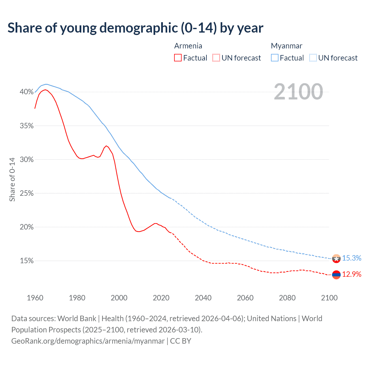 - The share of young demographic (0-15 years old) in Armenia is 19.2% vs 24.3% in Myanmar.