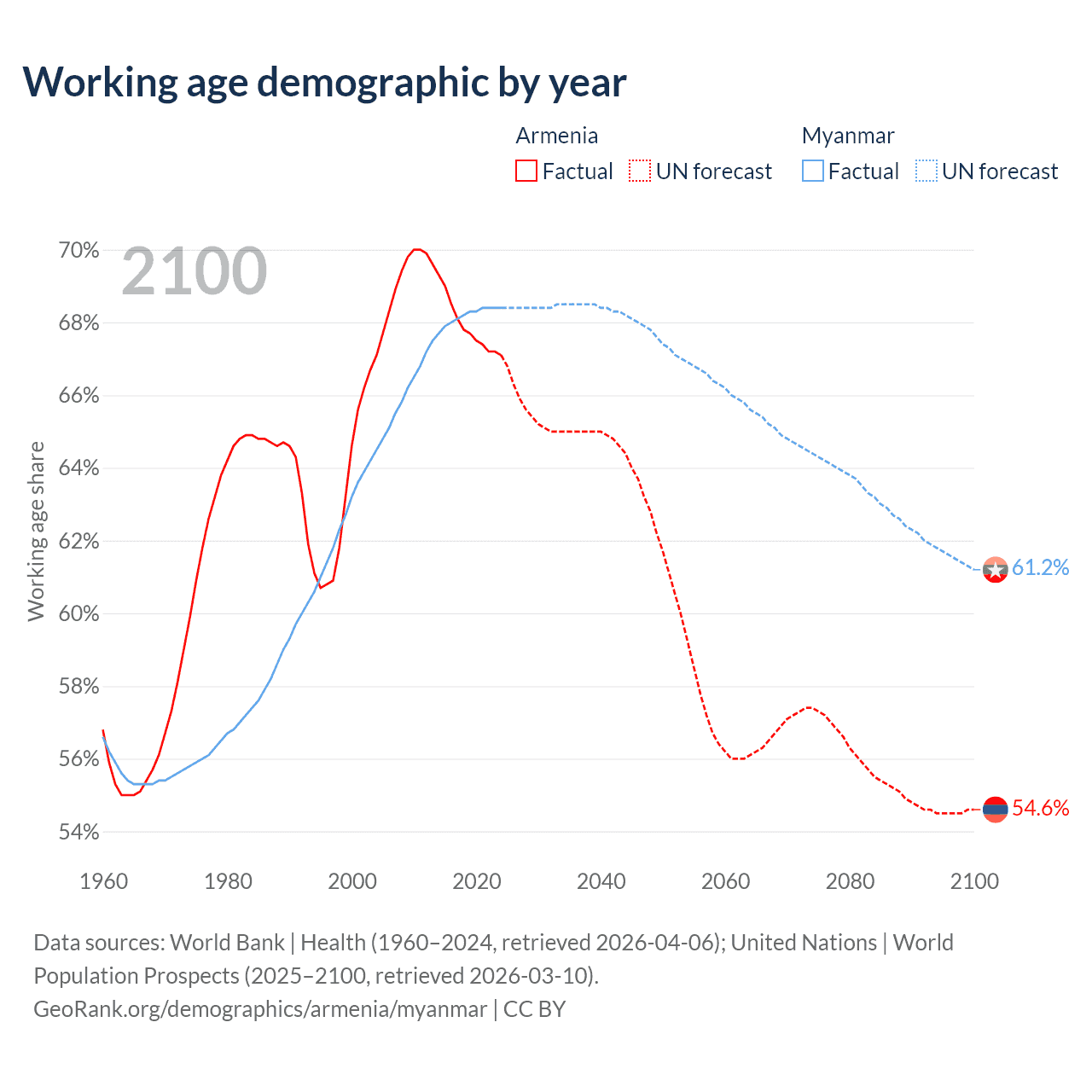 Median age Armenia vs Myanmar, 1960-2100