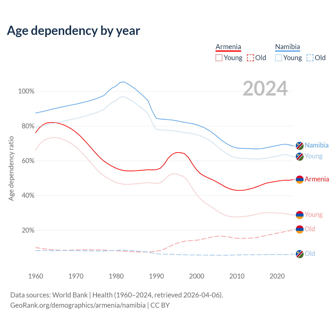 The share of older people aged 65 and over is 13.7% in Armenia and 3.67% in Namibia. Life expectancy in Armenia compared to Namibia .