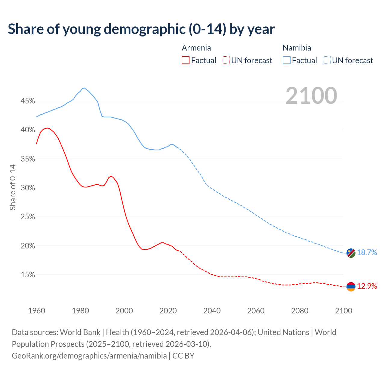 - The share of young demographic (0-15 years old) in Armenia is 19.2% vs 37% in Namibia.