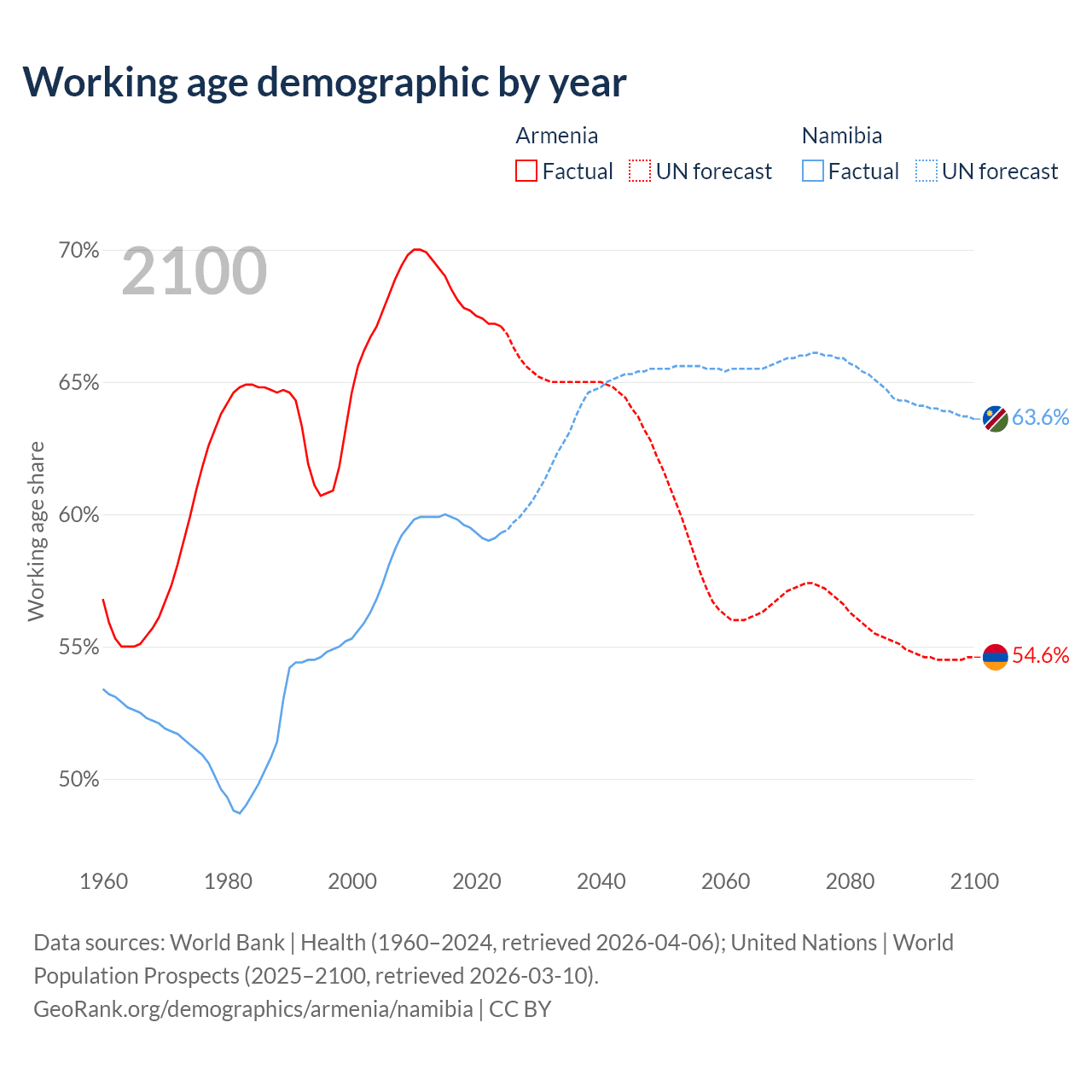 - Armenia has 2M working age adults (aged 15-64) vs 1.88M in Namibia.