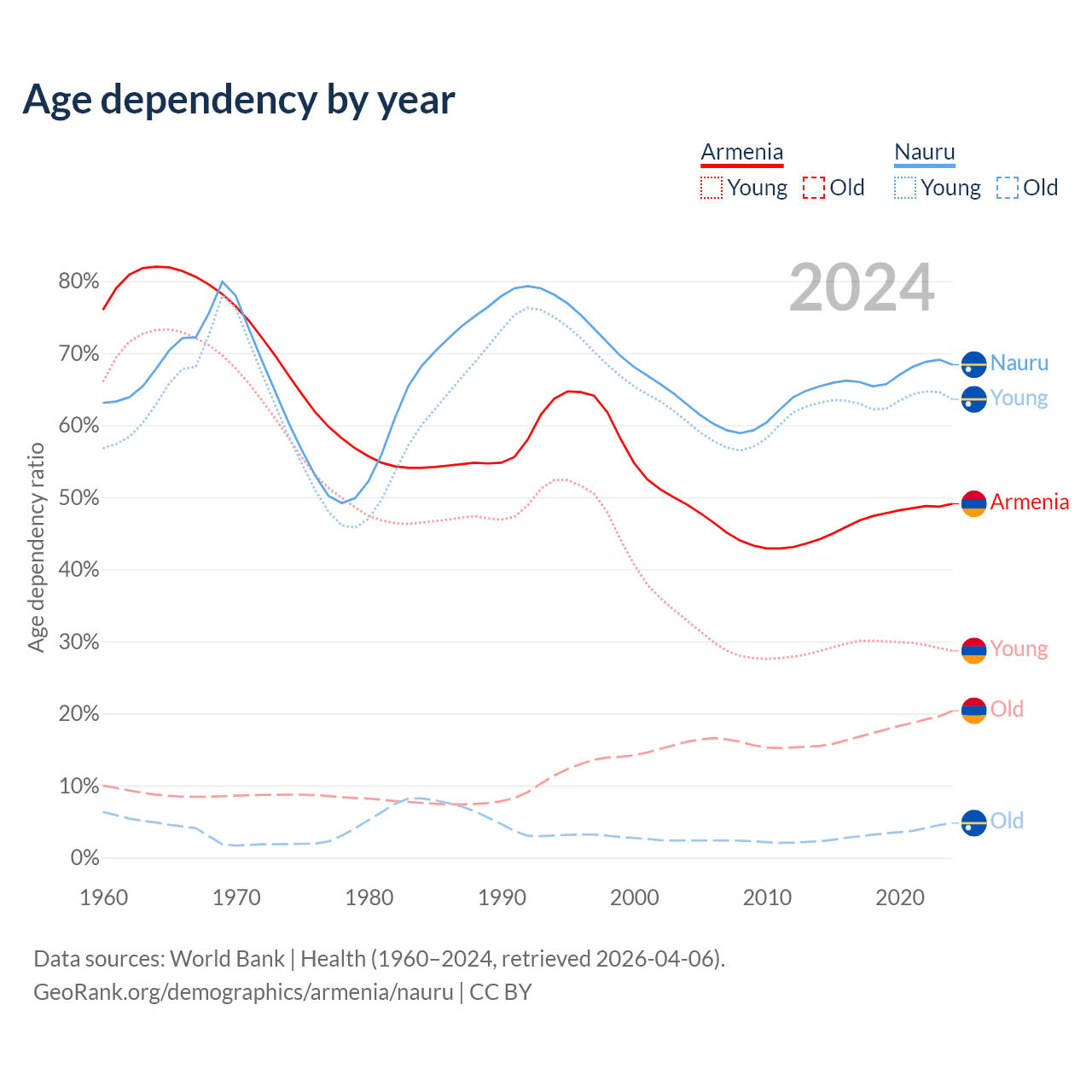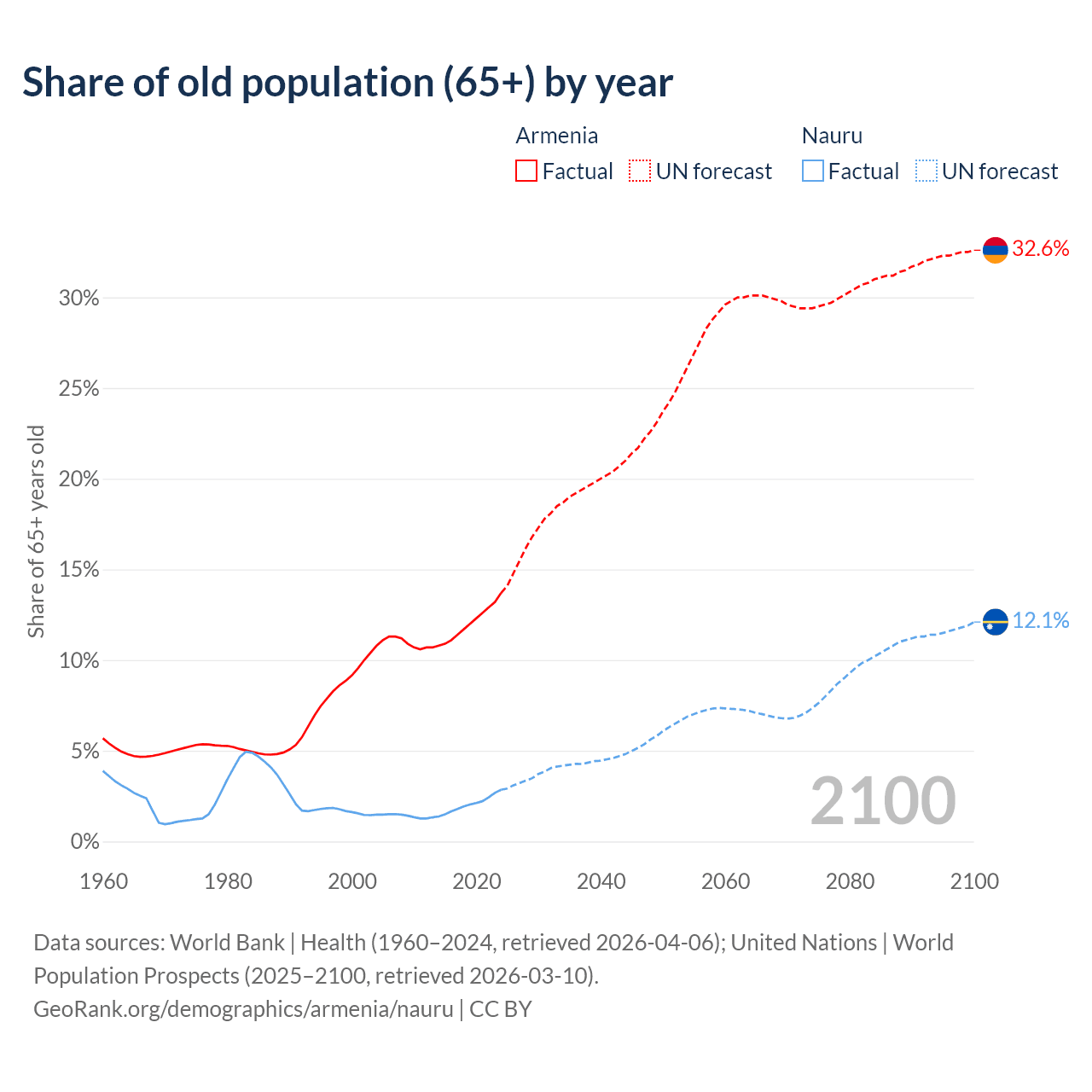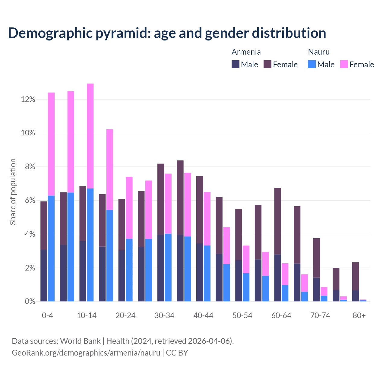 - The share of old-age demographic (65+) in Armenia is 13.7% vs 2.85% in Nauru.