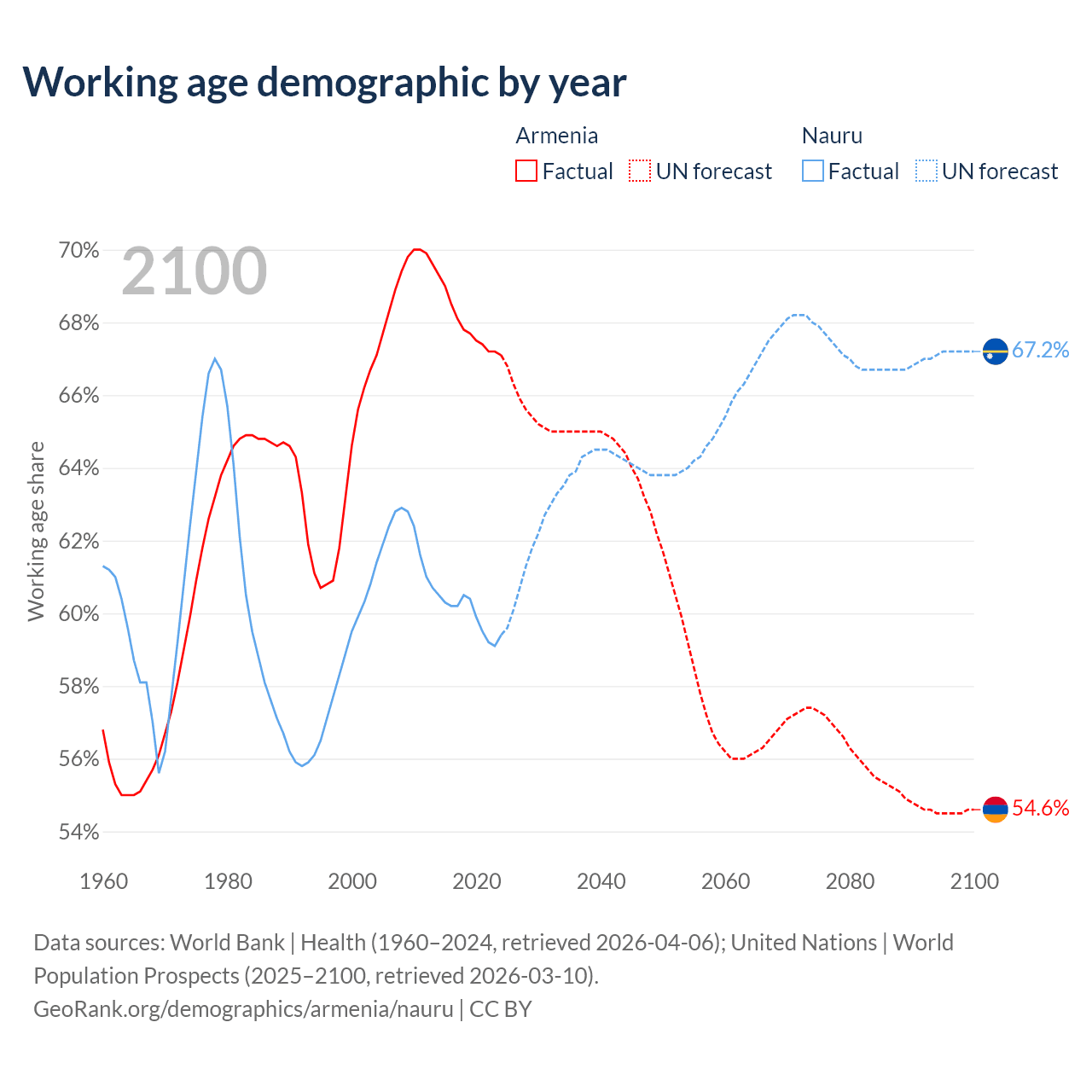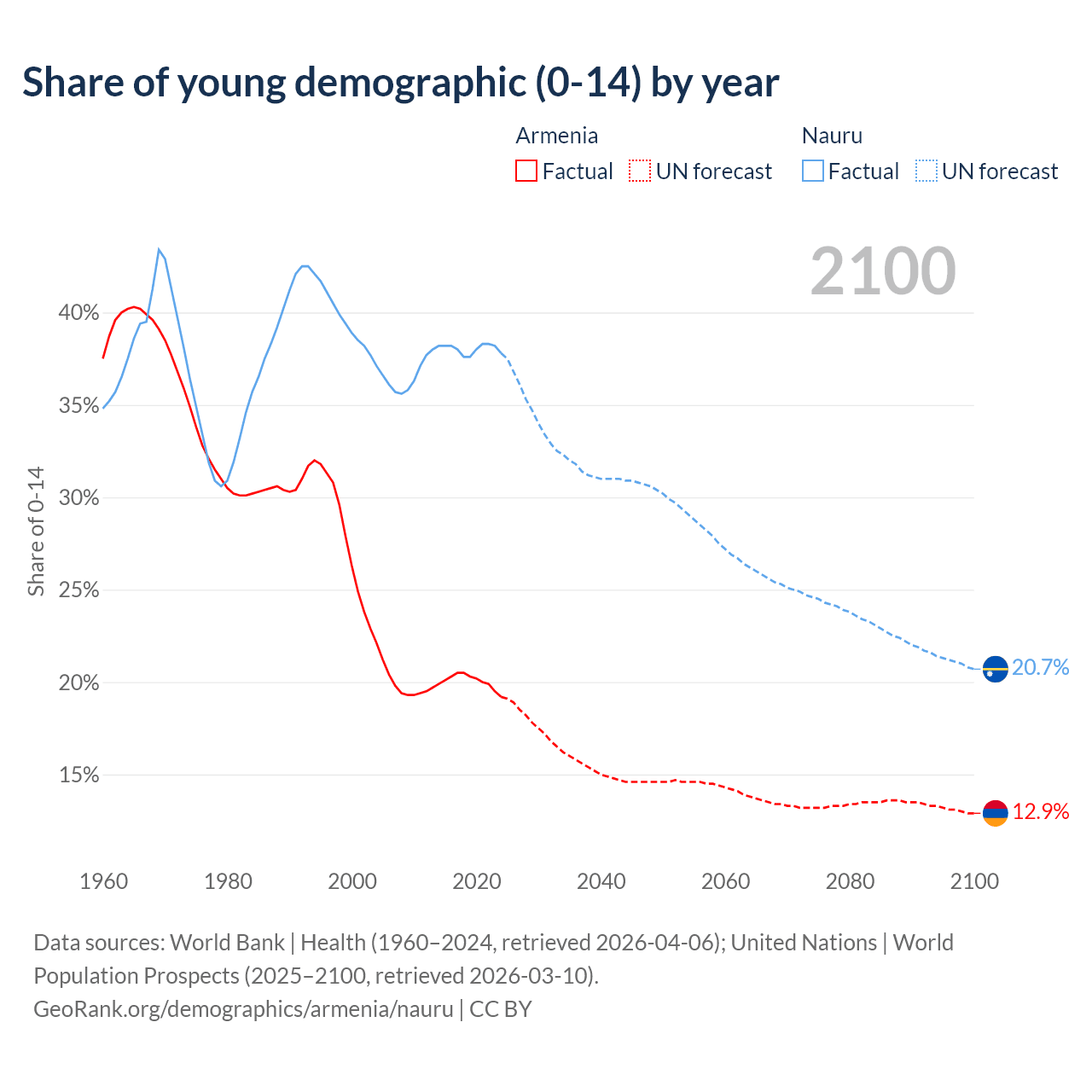 Median age Armenia vs Nauru, 1960-2100