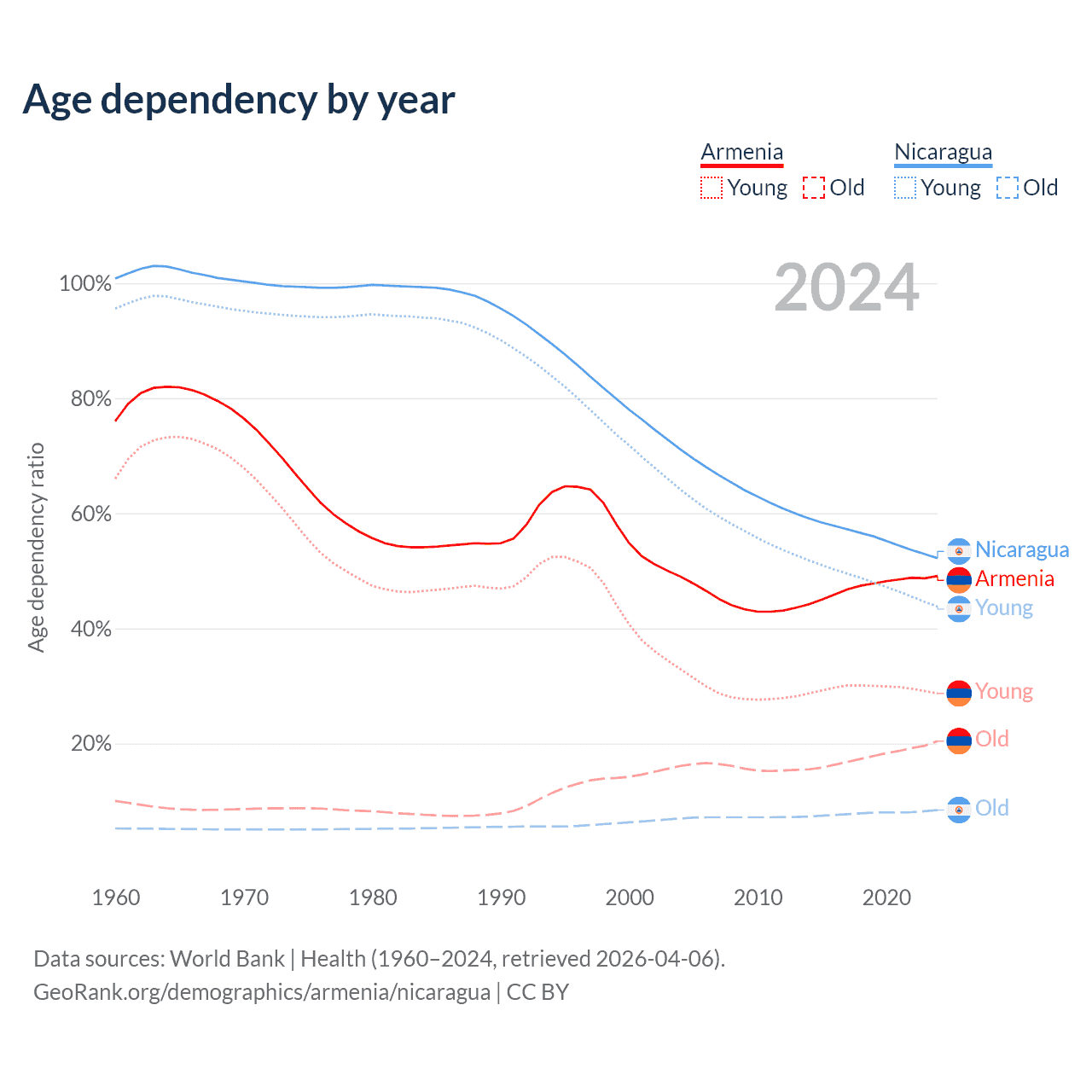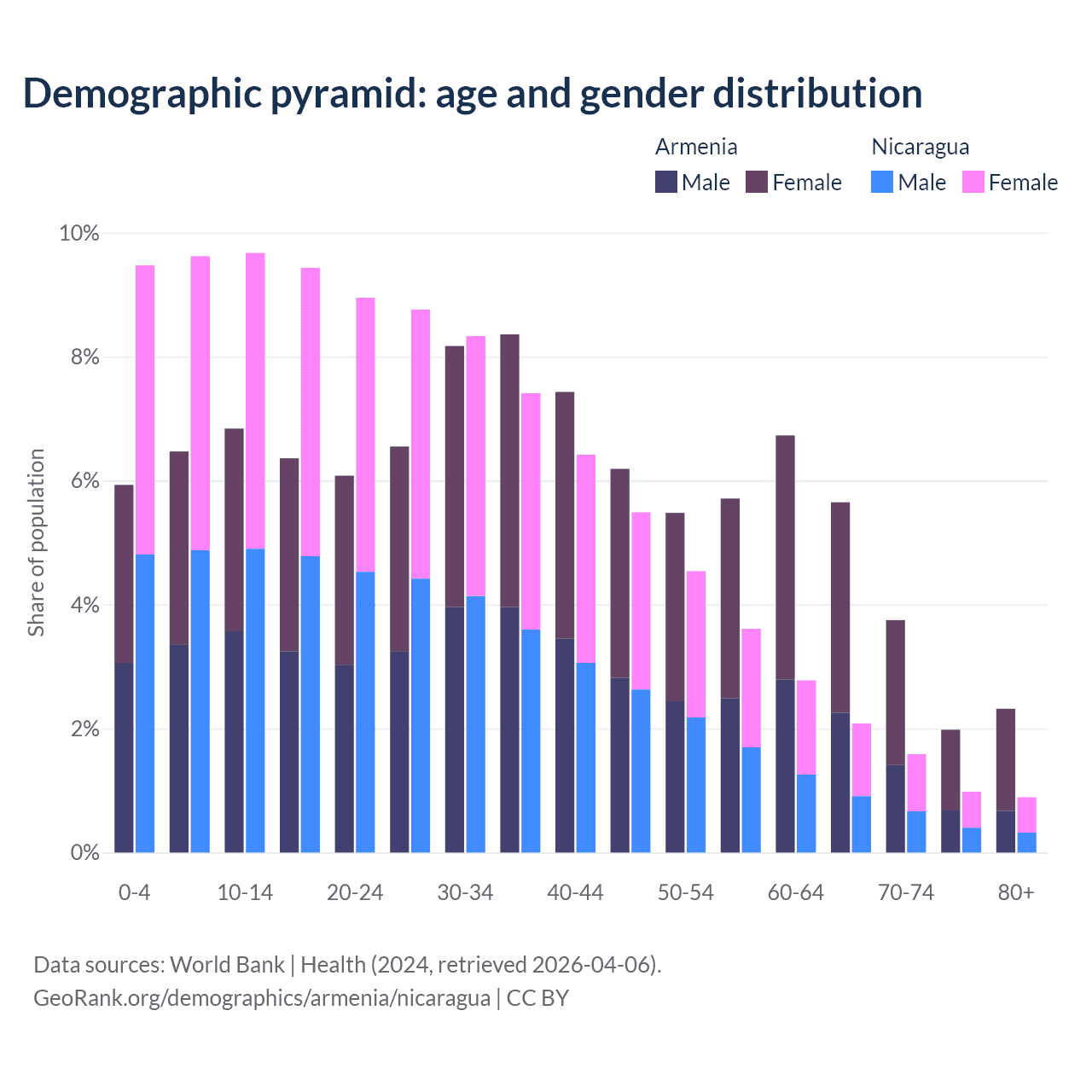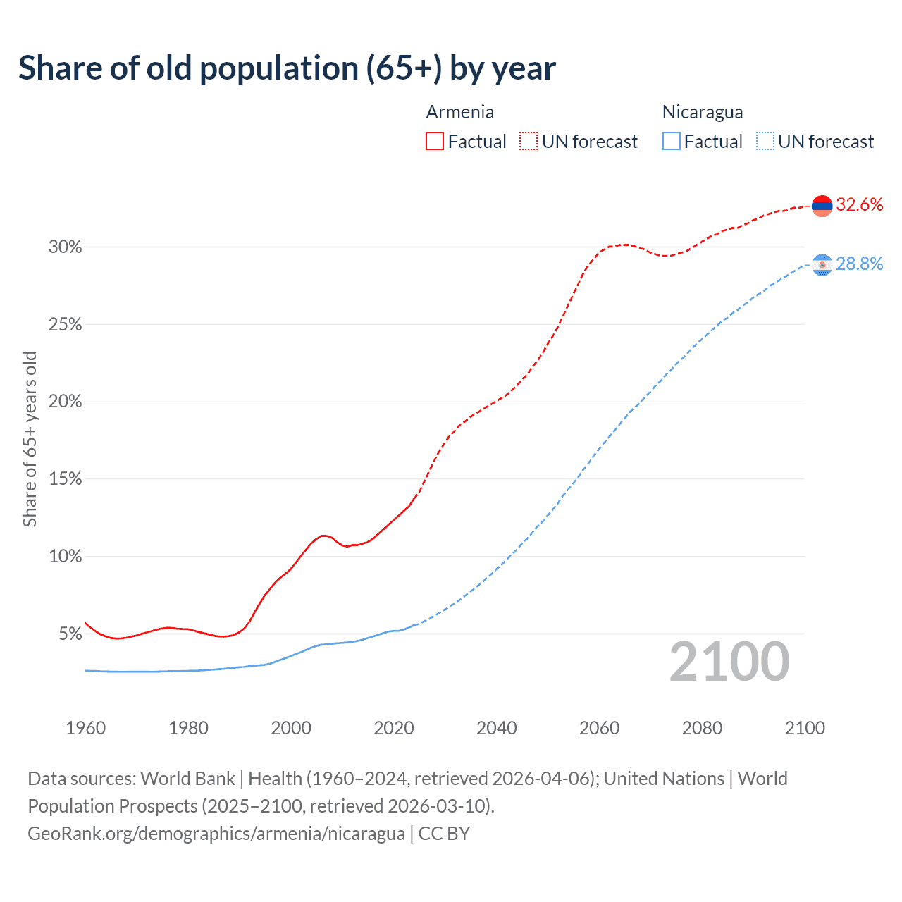 The share of older people aged 65 and over is 13.7% in Armenia and 5.53% in Nicaragua. Life expectancy in Armenia compared to Nicaragua .