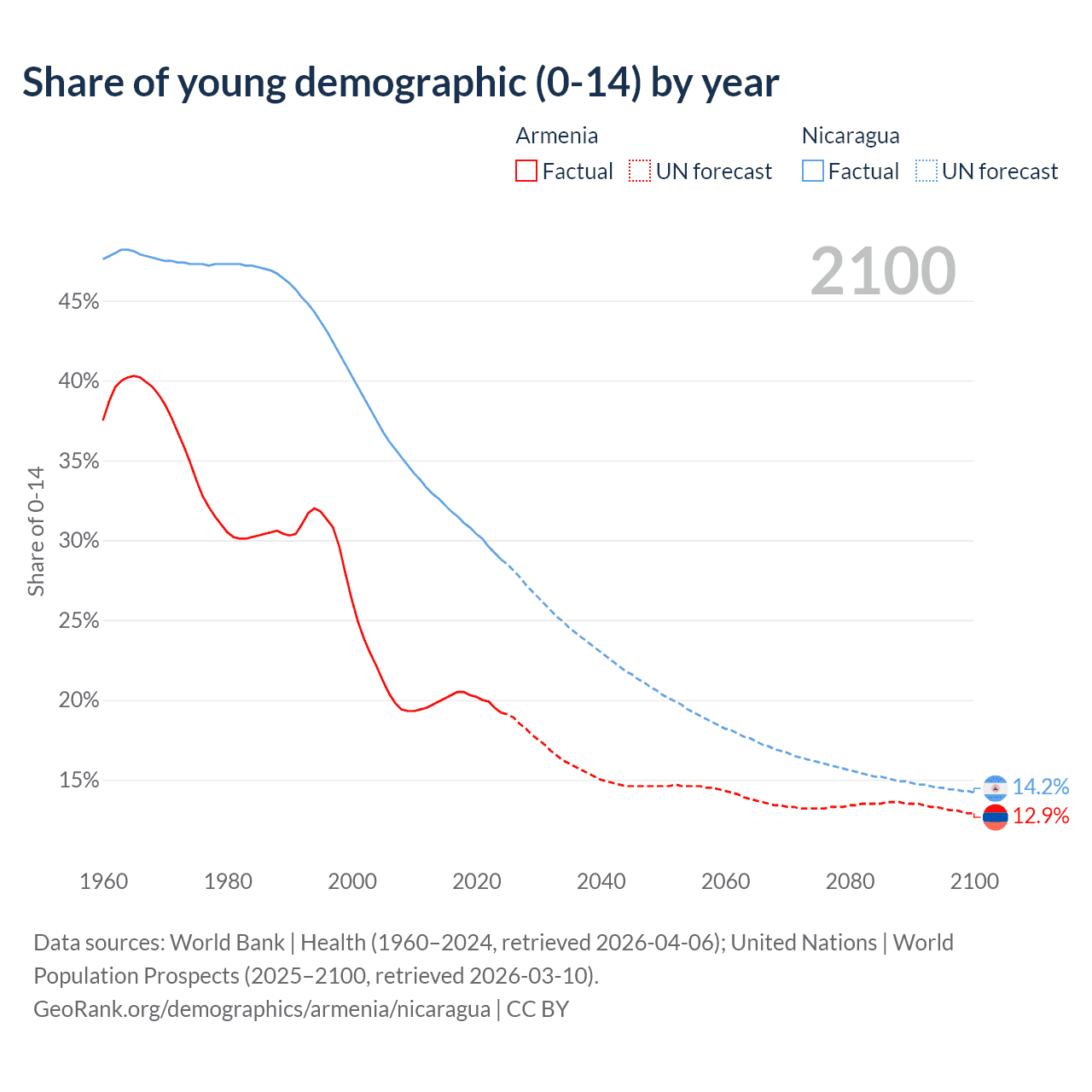 - The share of young demographic (0-15 years old) in Armenia is 19.2% vs 28.8% in Nicaragua.