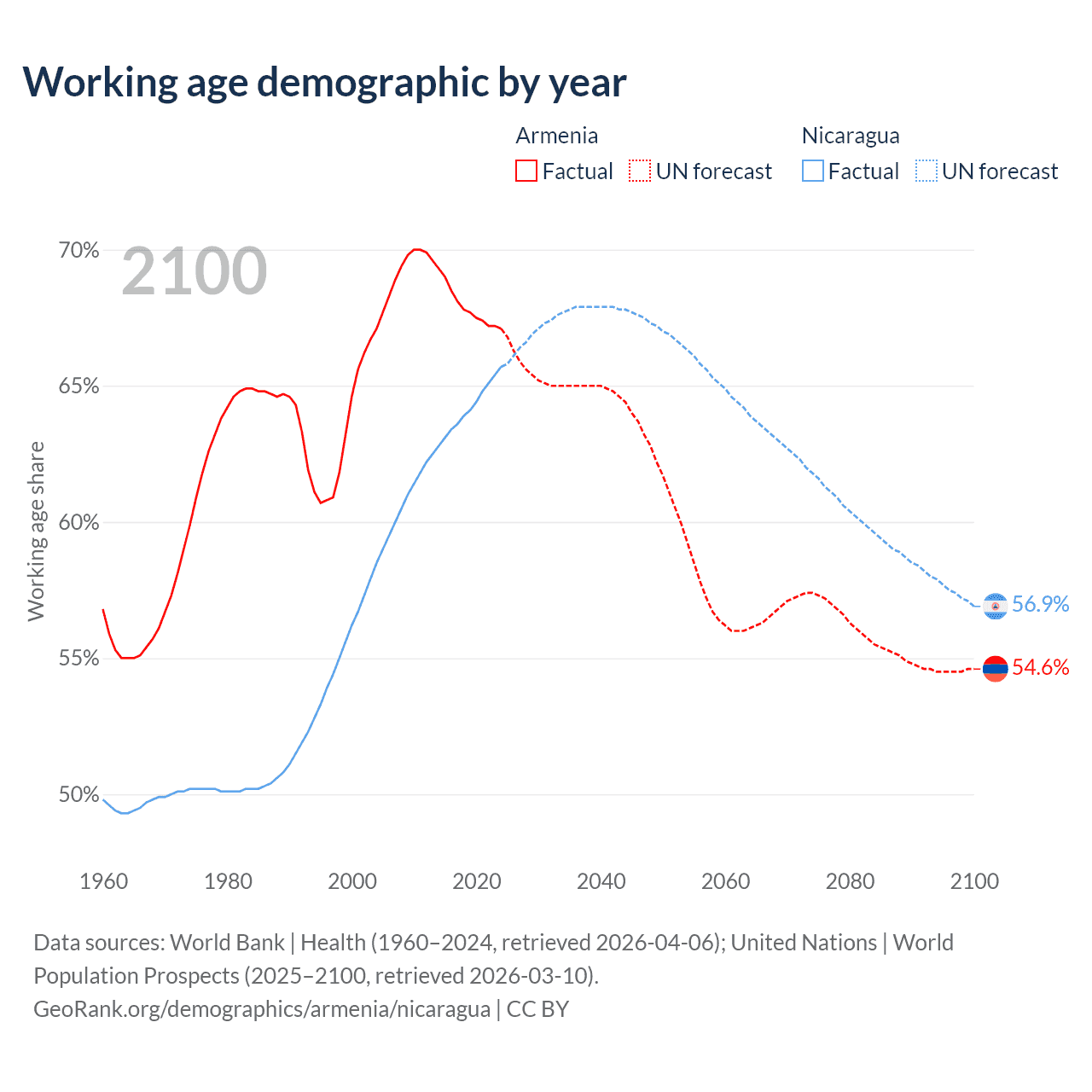 - Armenia has 2M working age adults (aged 15-64) vs 4.68M in Nicaragua.