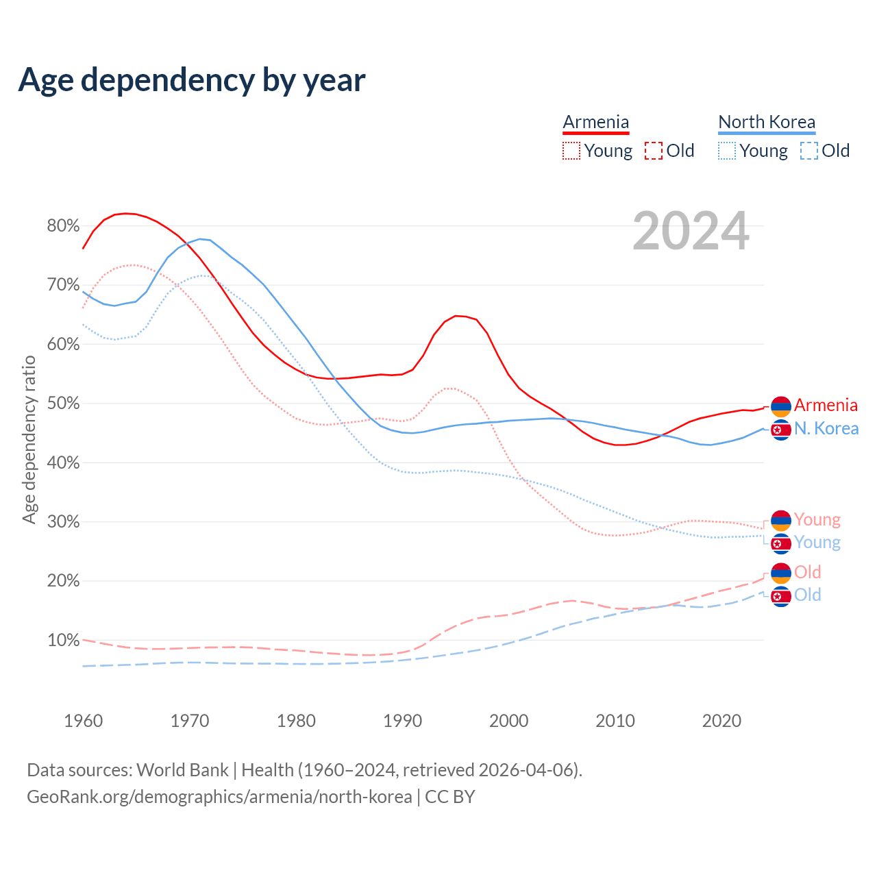 - The share of old-age demographic (65+) in Armenia is 13.7% vs 12.4% in North Korea.