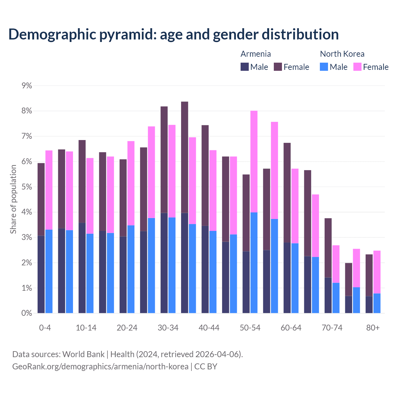 - Armenia is ranked 64/196 by median age (oldest to youngest) vs 62/196 for North Korea.
