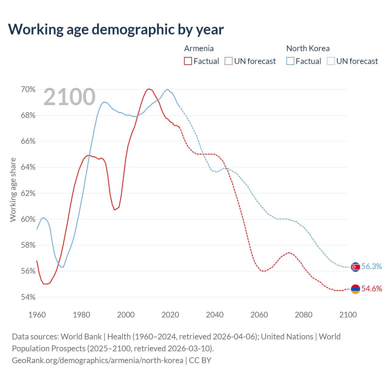 - Armenia has 2M working age adults (aged 15-64) vs 18.3M in North Korea.