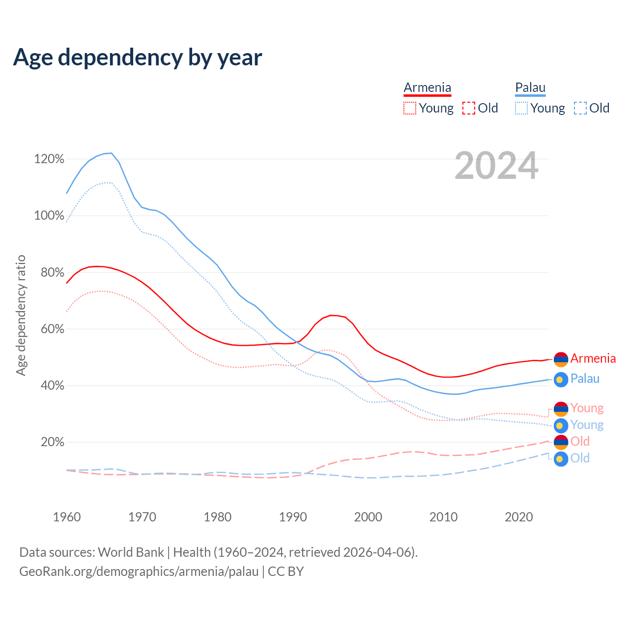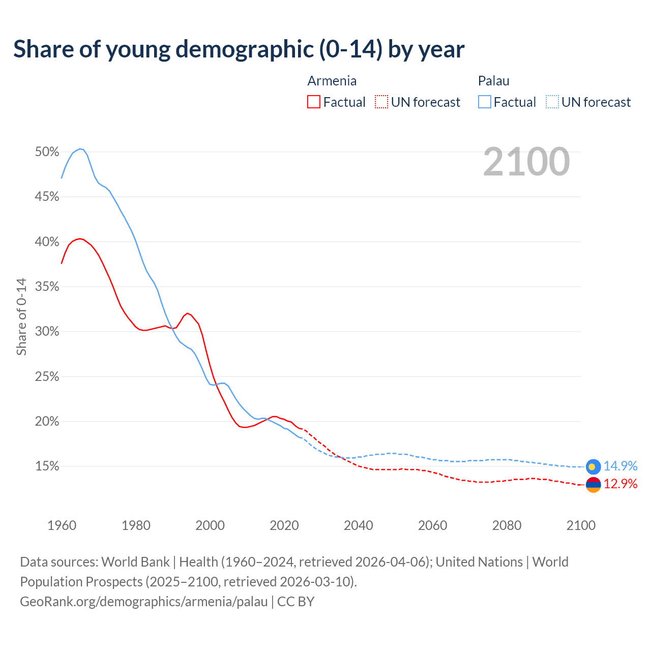 - The share of young demographic (0-15 years old) in Armenia is 19.2% vs 18.2% in Palau.
