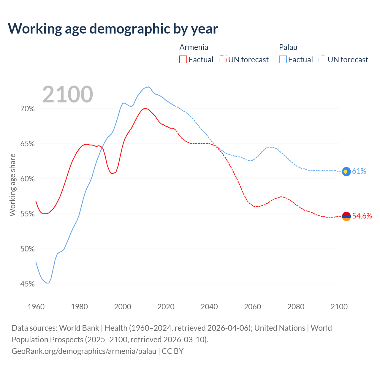 Median age Armenia vs Palau, 1960-2100