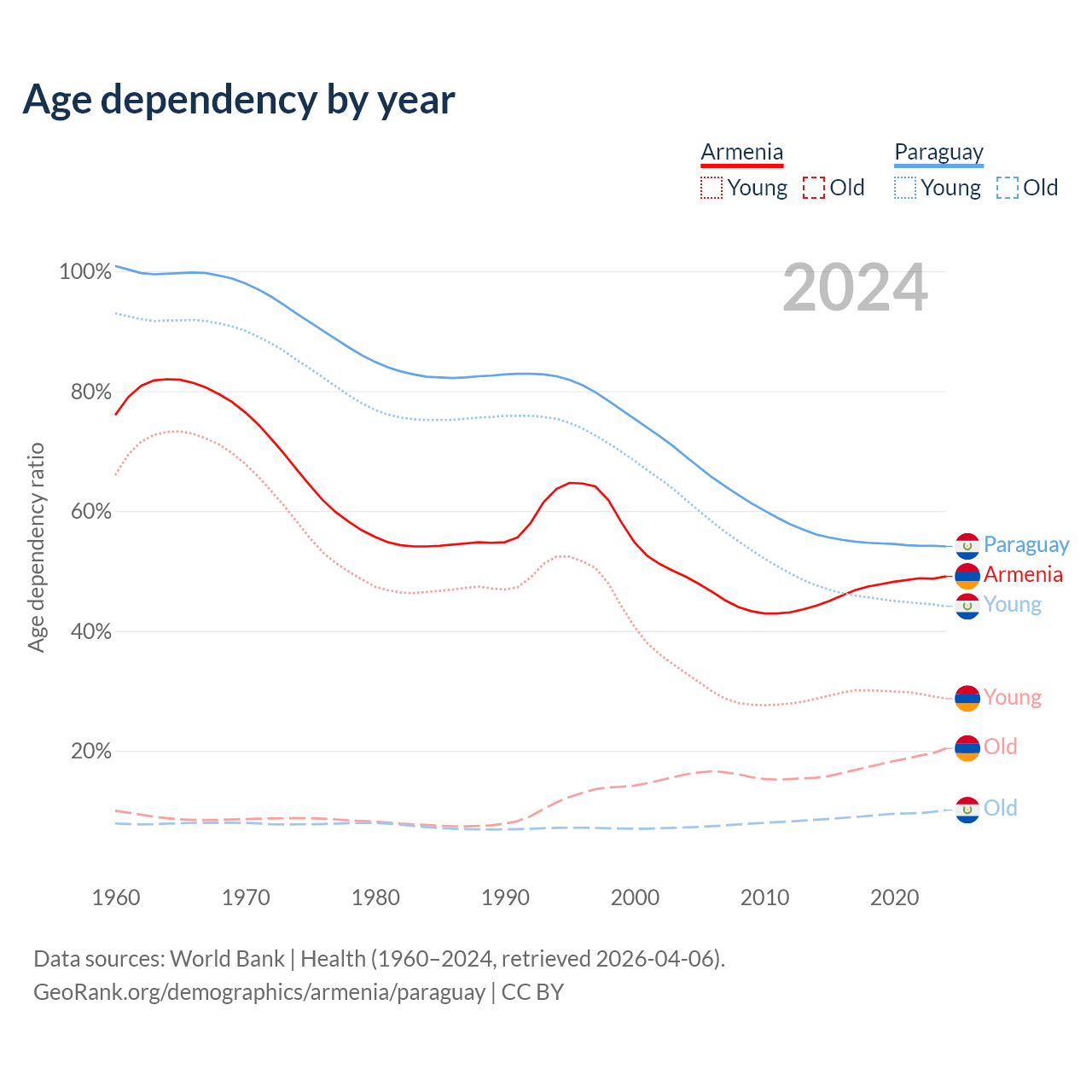 Data sources: World Bank | Health (1960–2024, retrieved 2026-04-06); U.S. Census Bureau (1960–2024, retrieved 2026-02-08).