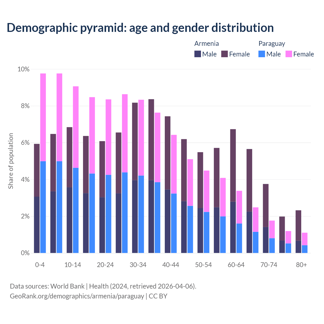 The share of older people aged 65 and over is 13.7% in Armenia and 6.54% in Paraguay. Life expectancy in Armenia compared to Paraguay .