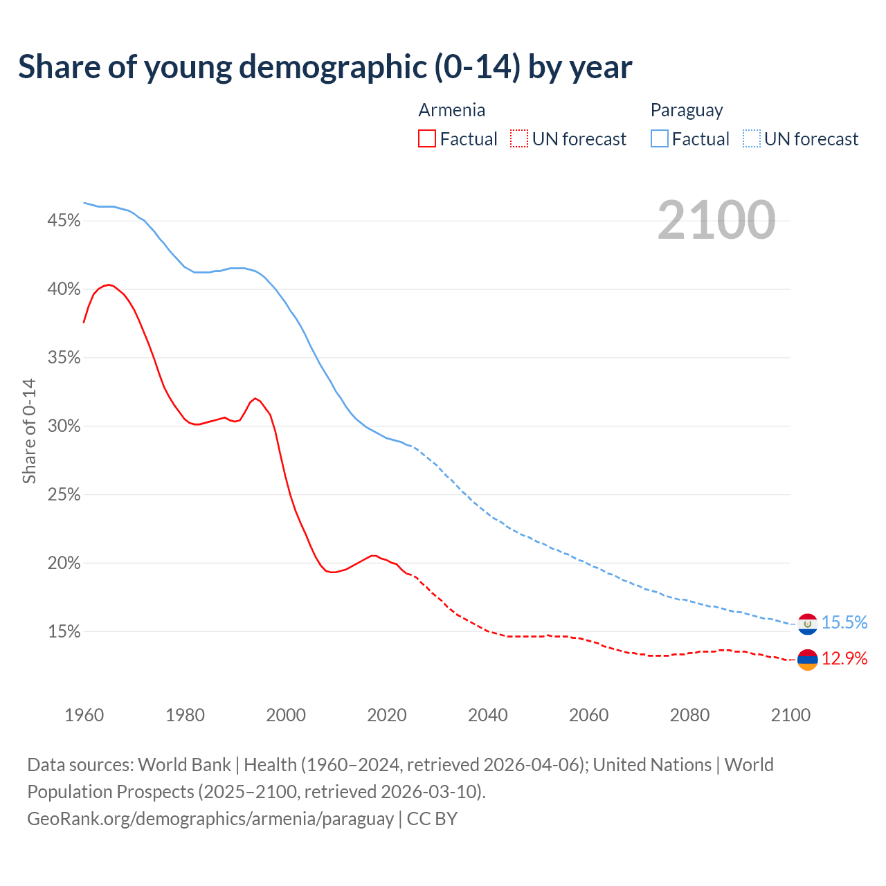 - The share of young demographic (0-15 years old) in Armenia is 19.2% vs 28.6% in Paraguay.