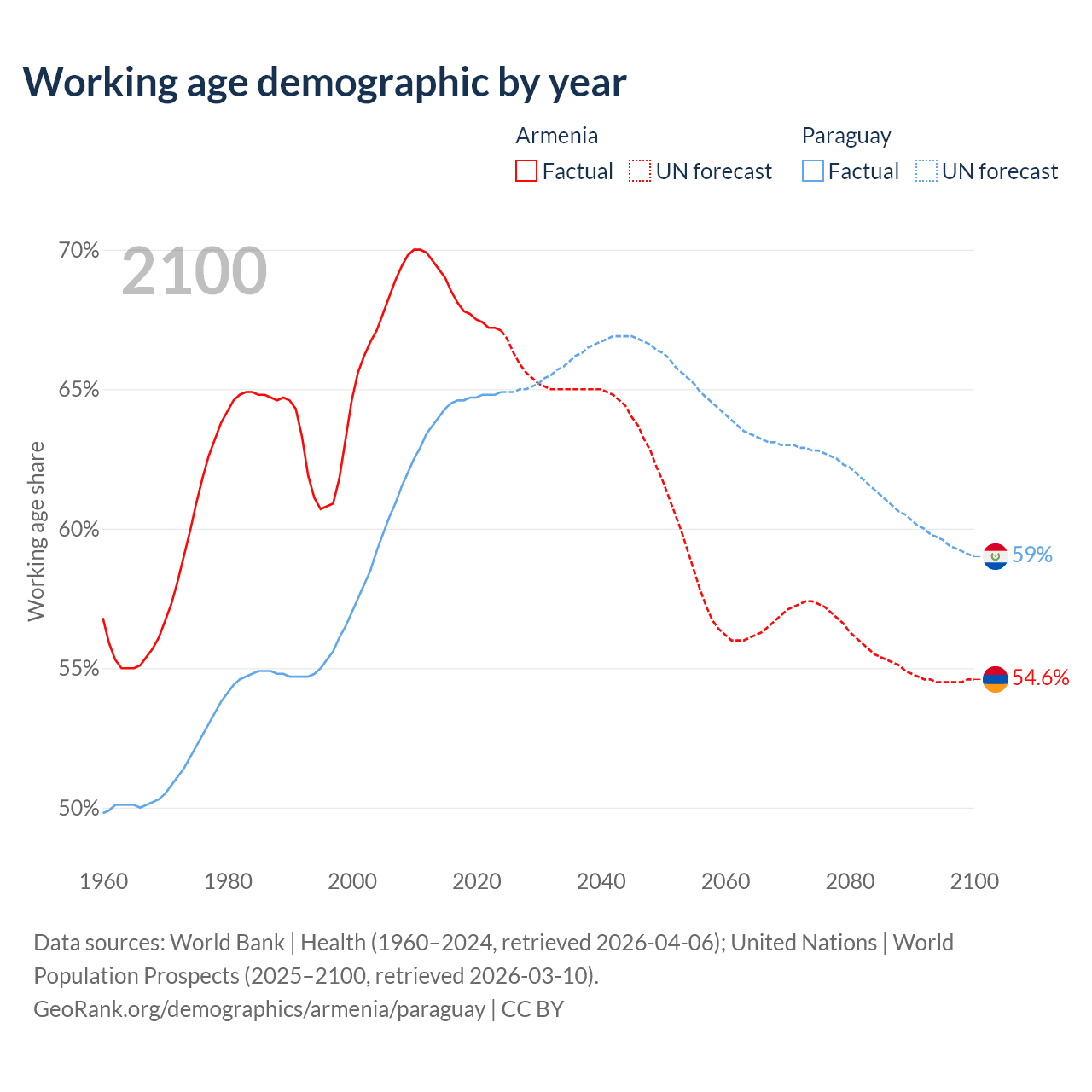 Median age Armenia vs Paraguay, 1960-2100