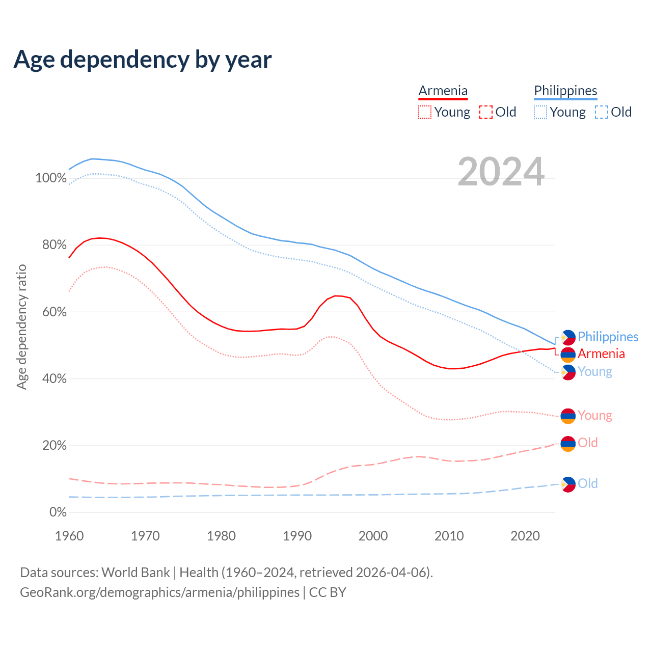Data sources: World Bank | Health (1960–2024, retrieved 2026-04-06); U.S. Census Bureau (1960–2024, retrieved 2026-02-08).