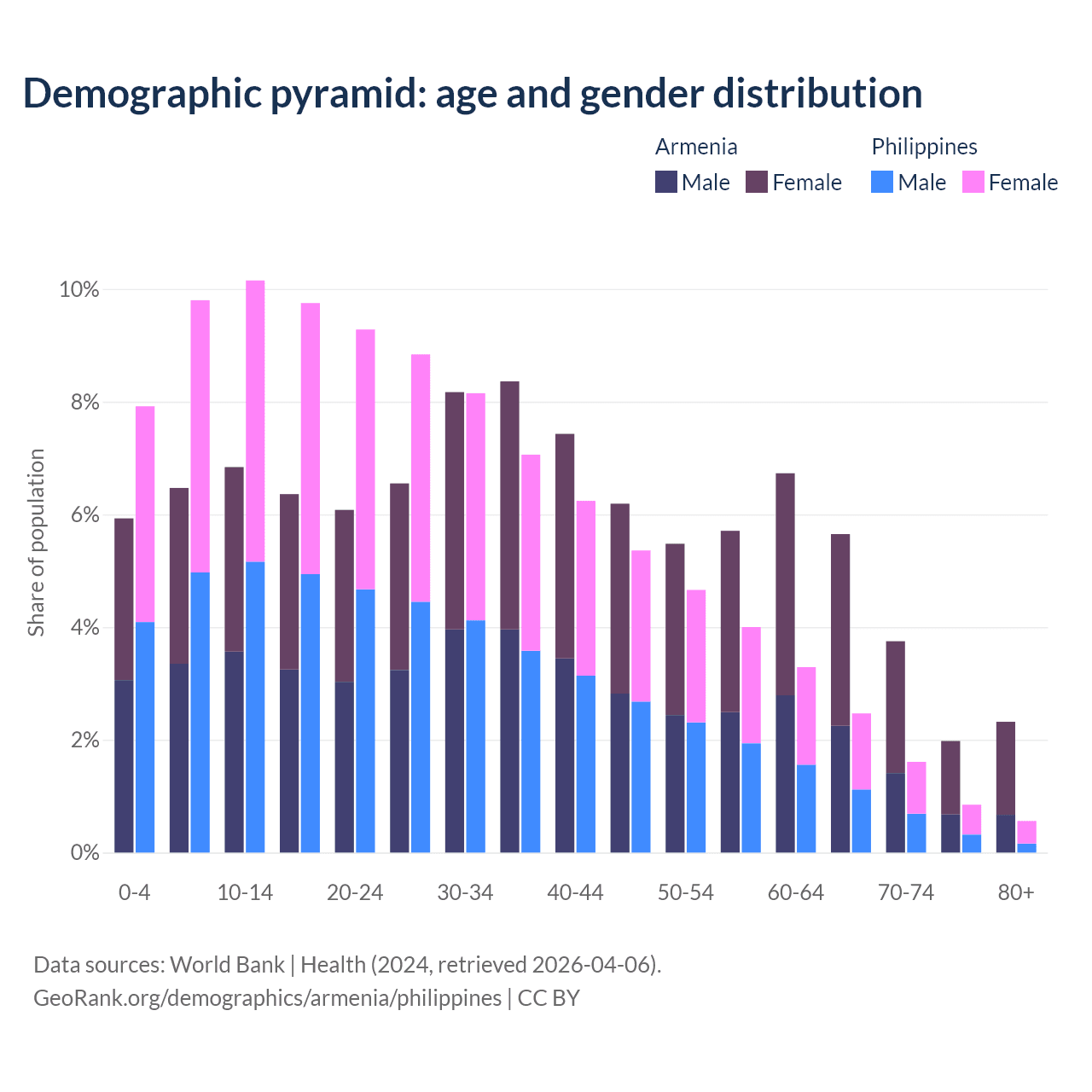 - Armenia is ranked 64/196 by median age (oldest to youngest) vs 123/196 for the Philippines.