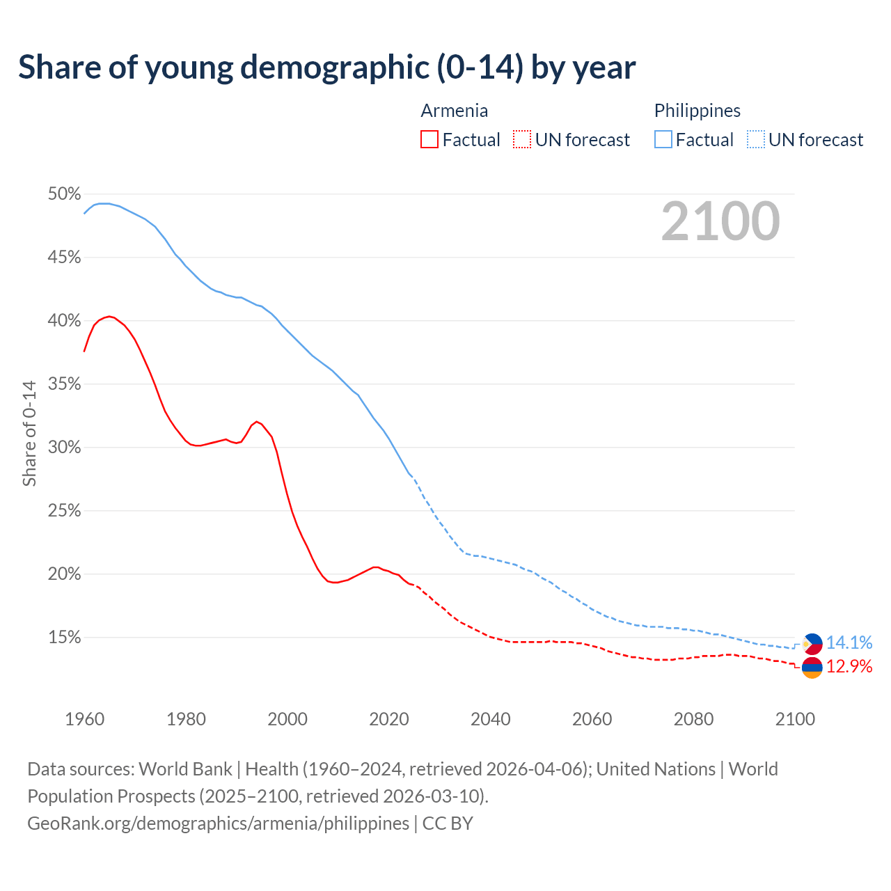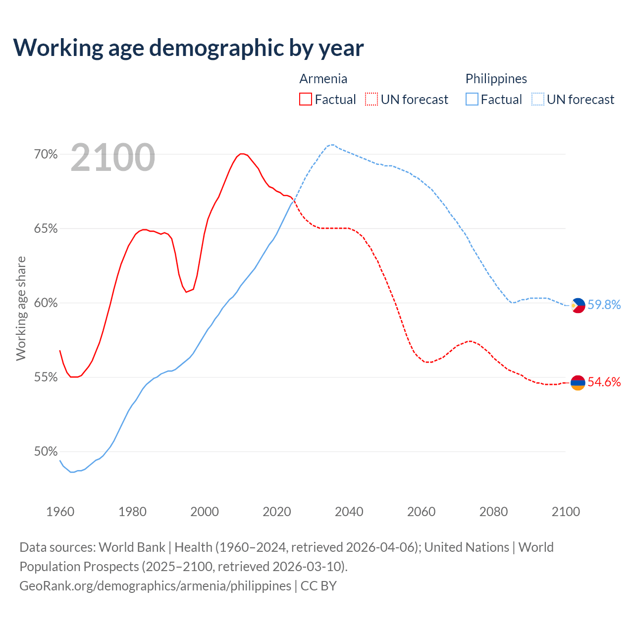 Median age Armenia vs Philippines, 1960-2100