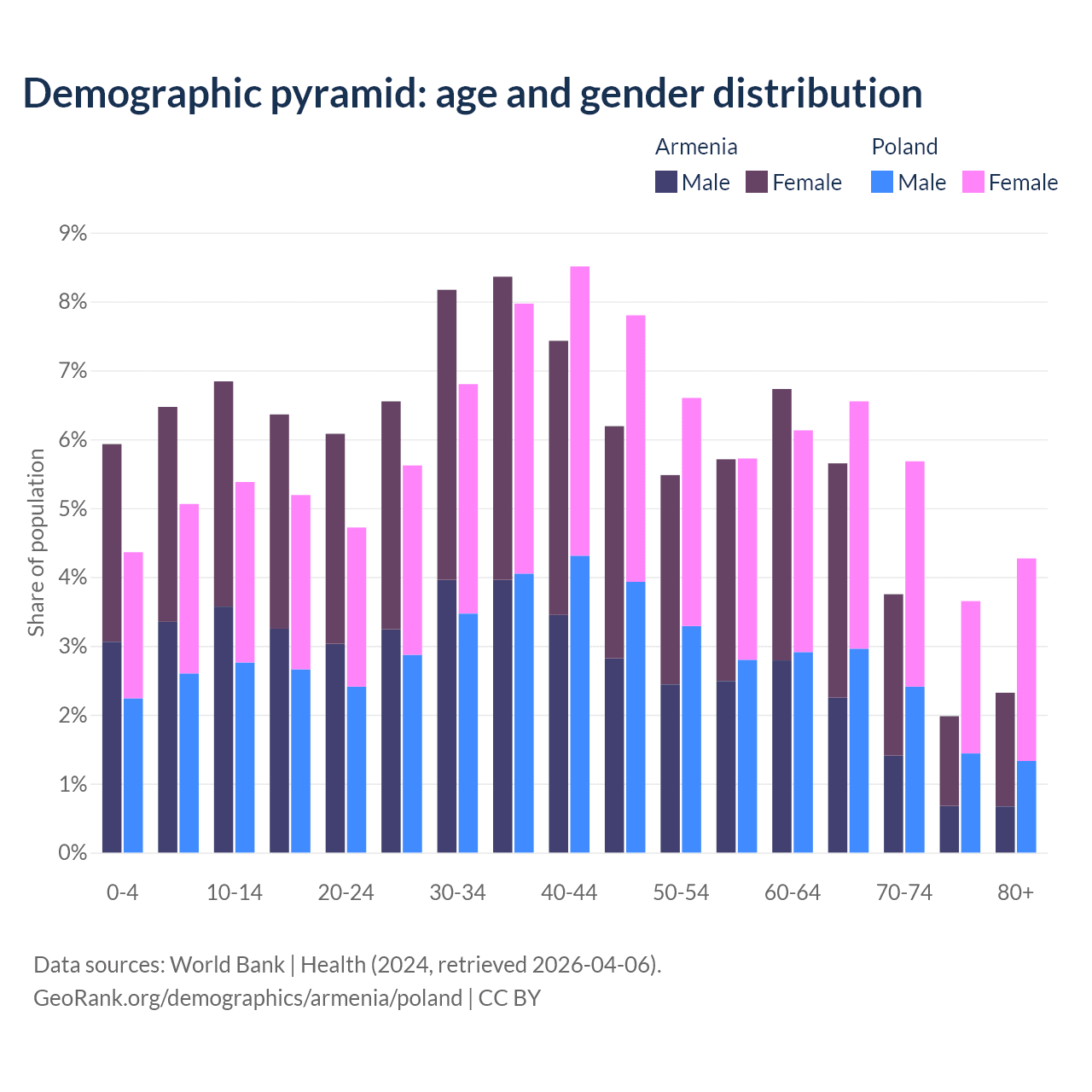 The share of older people aged 65 and over is 13.7% in Armenia and 20.1% in Poland. Life expectancy in Armenia compared to Poland .