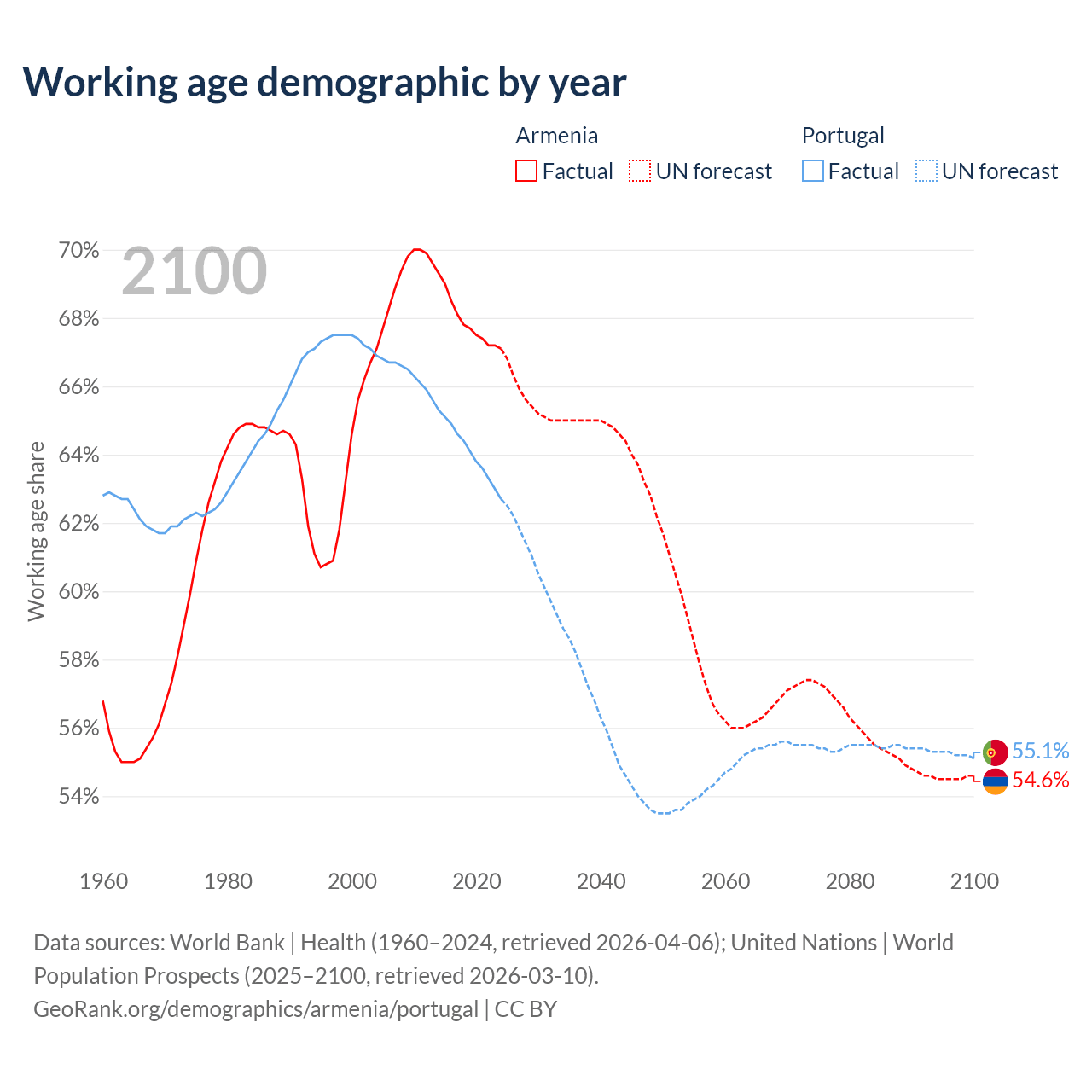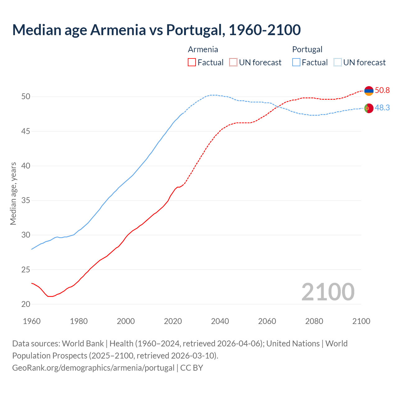 Median age Armenia vs Portugal, 1960-2100