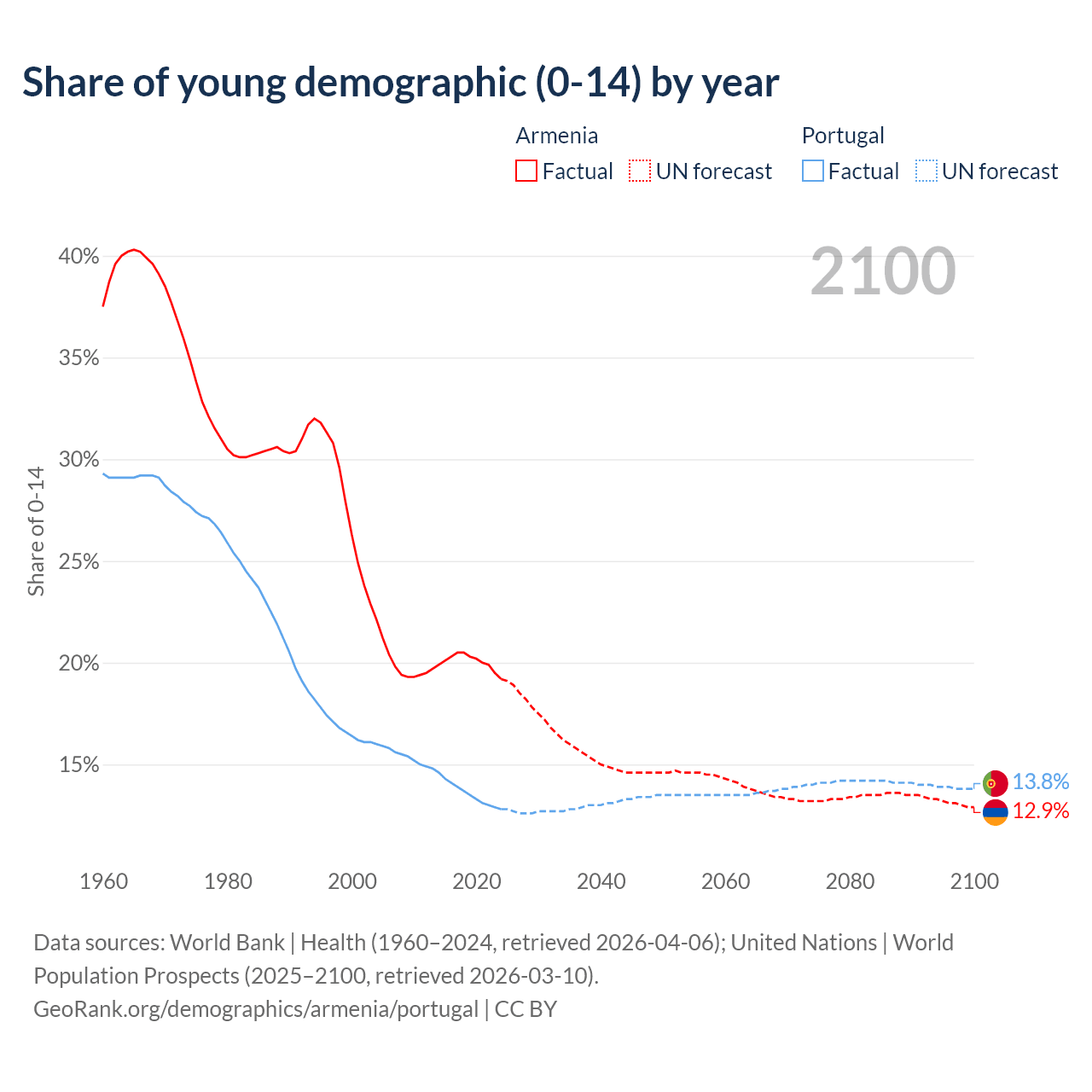 - The share of young demographic (0-15 years old) in Armenia is 19.2% vs 12.8% in Portugal.