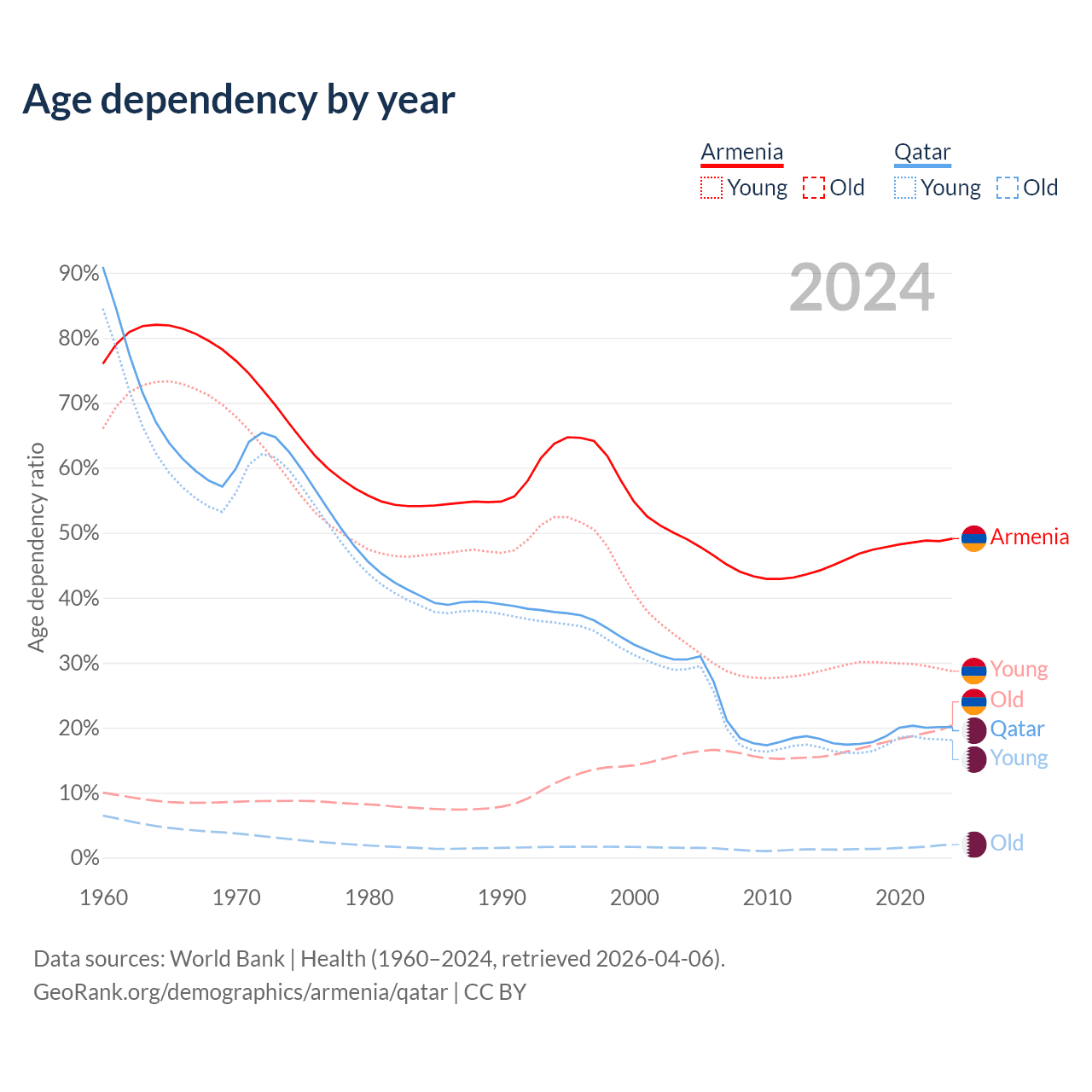 - Armenia is ranked 64/196 by median age (oldest to youngest) vs 78/196 for Qatar.