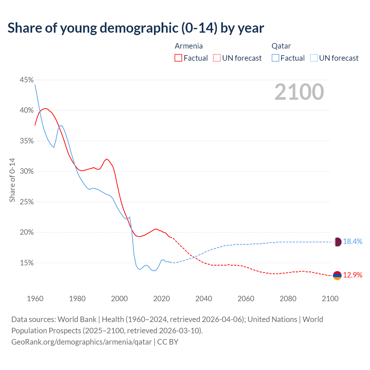 - The share of young demographic (0-15 years old) in Armenia is 19.2% vs 15.1% in Qatar.
