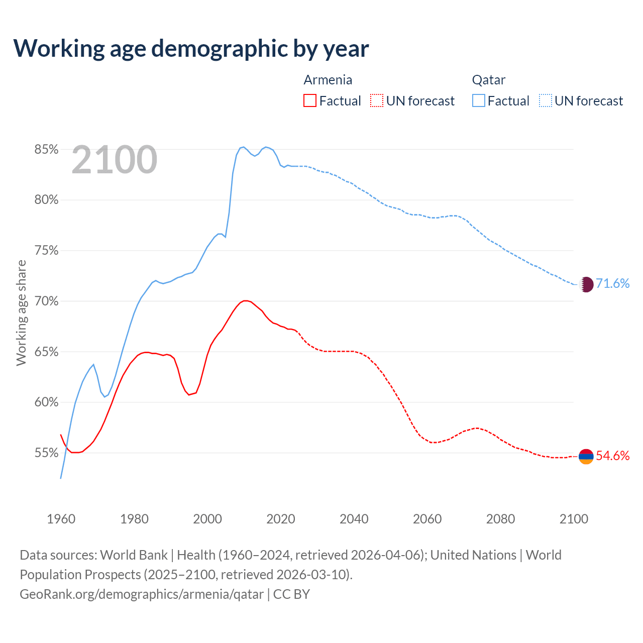 Median age Armenia vs Qatar, 1960-2100