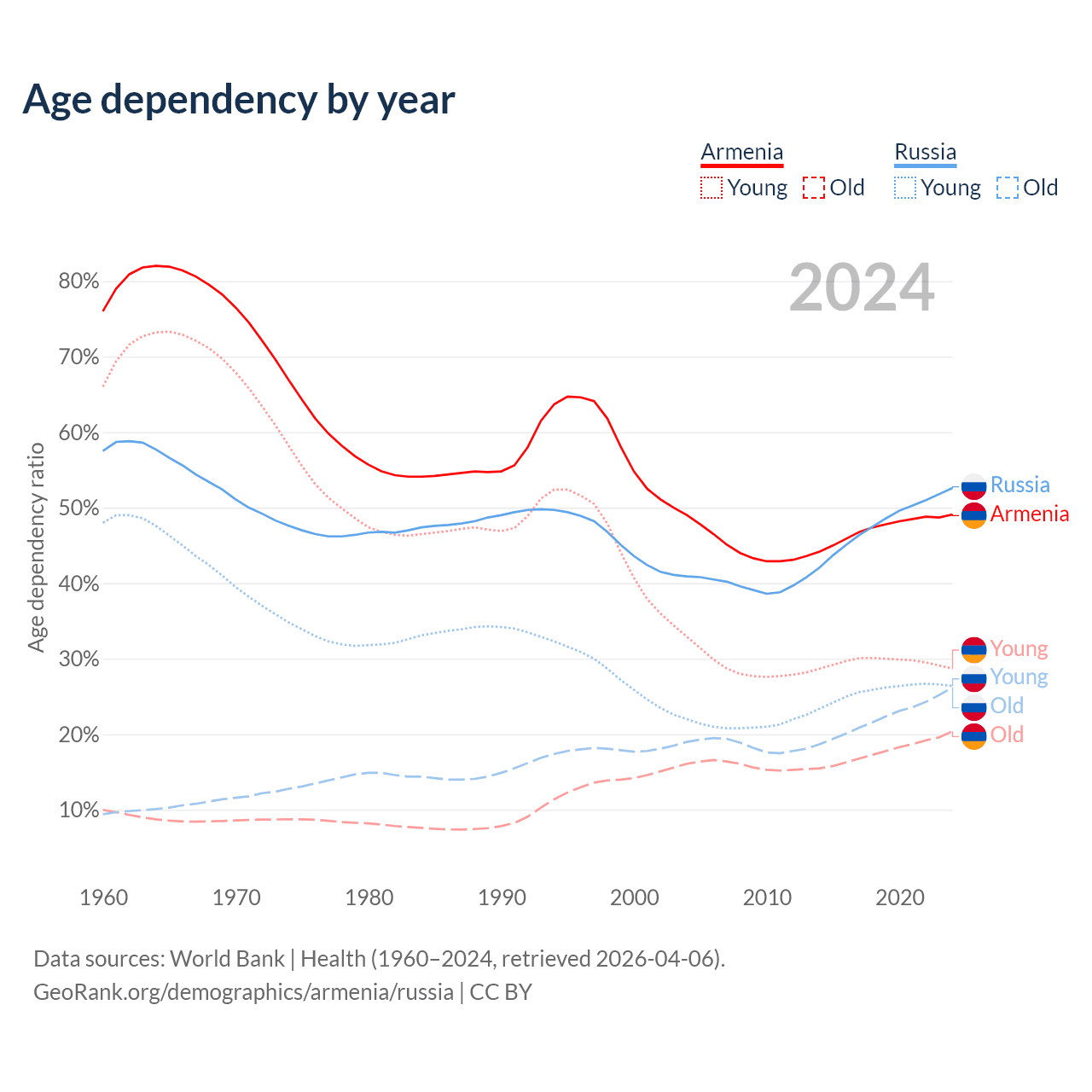 The share of older people aged 65 and over is 13.7% in Armenia and 17.2% in Russia. Life expectancy in Armenia compared to Russia .