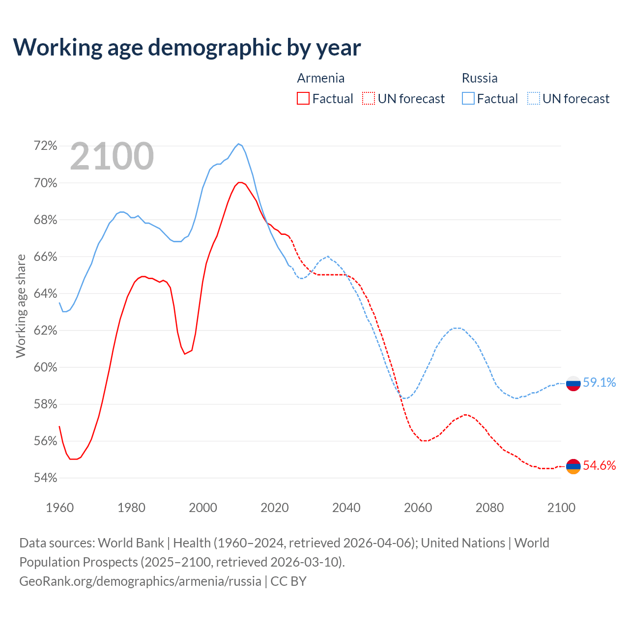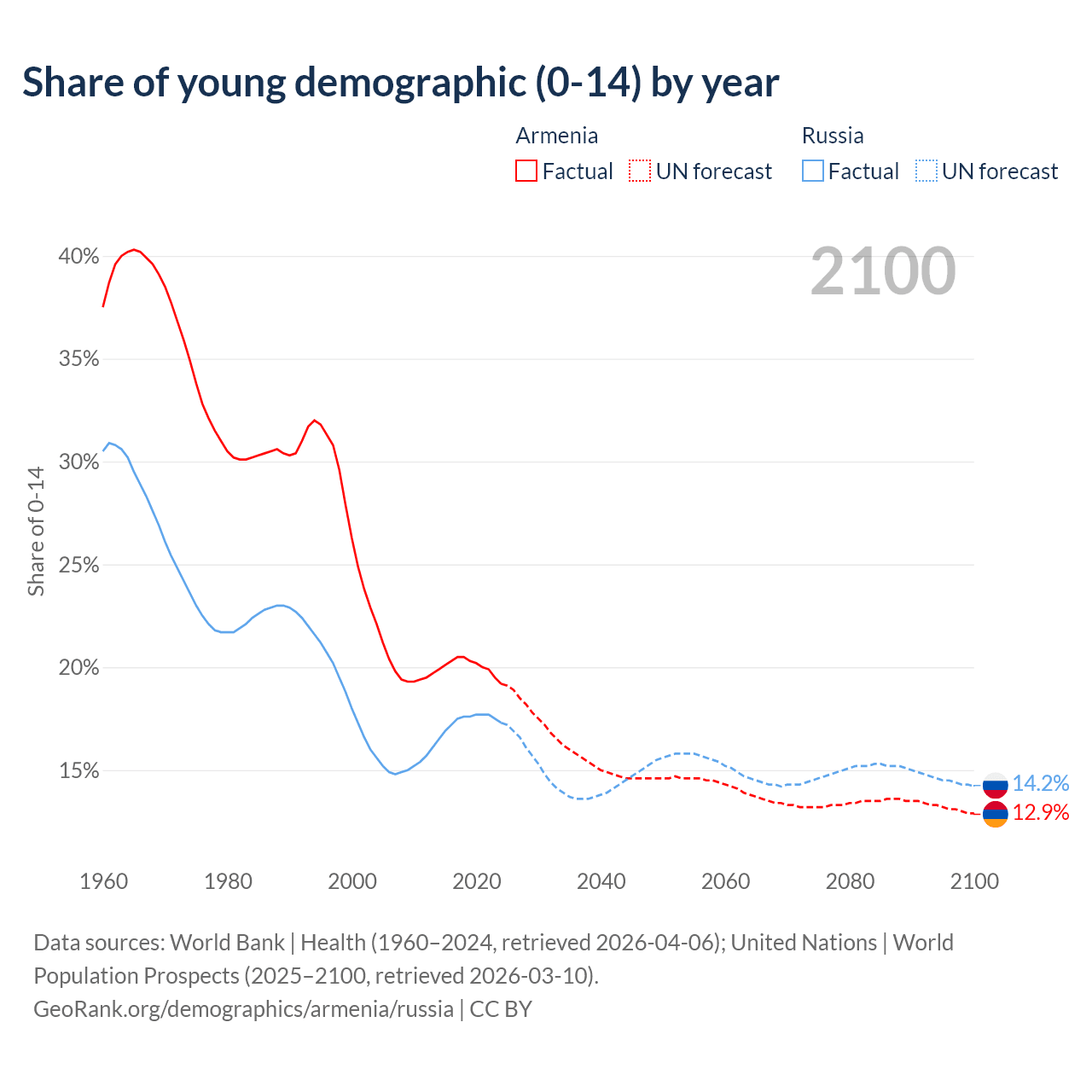Median age Armenia vs Russia, 1960-2100