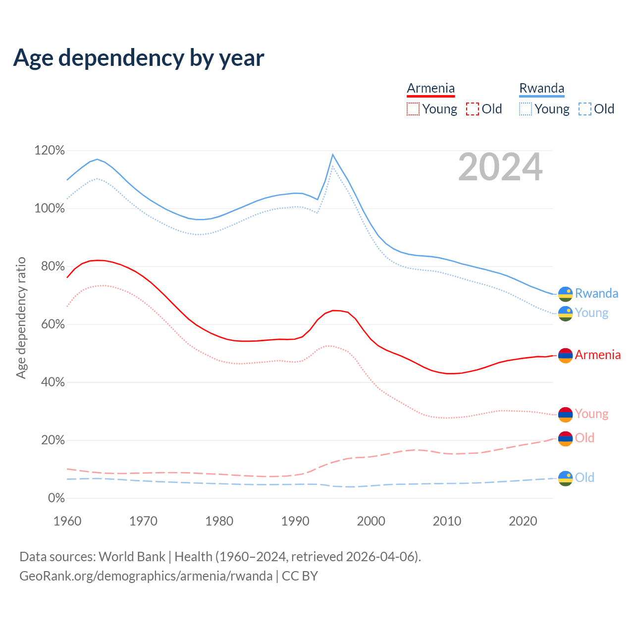- Armenia is ranked 64/196 by median age (oldest to youngest) vs 160/196 for Rwanda.